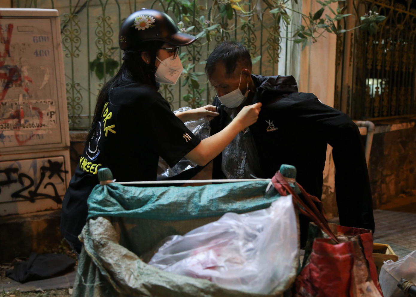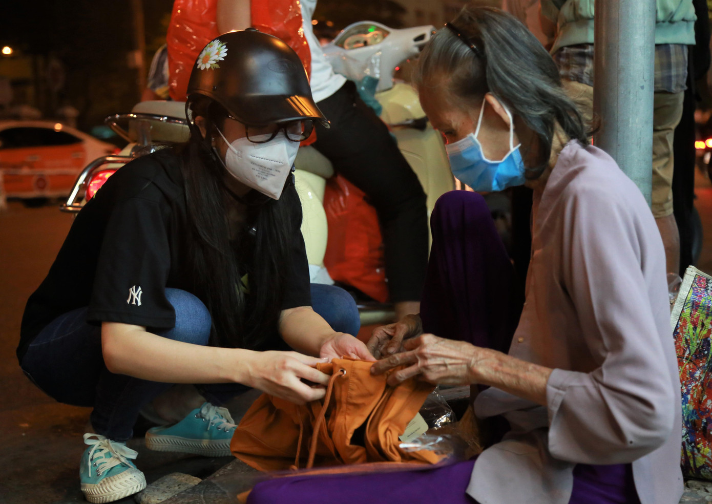 | Trúc Phương mặc chiếc áo khoác cho người phụ nữ nhặt ve chai trên đường Khánh Hội, quận 4. Người phụ nữ lam lũ rưng rưng xúc động với món quà nghĩa tình trong đêm mưu sinh. |