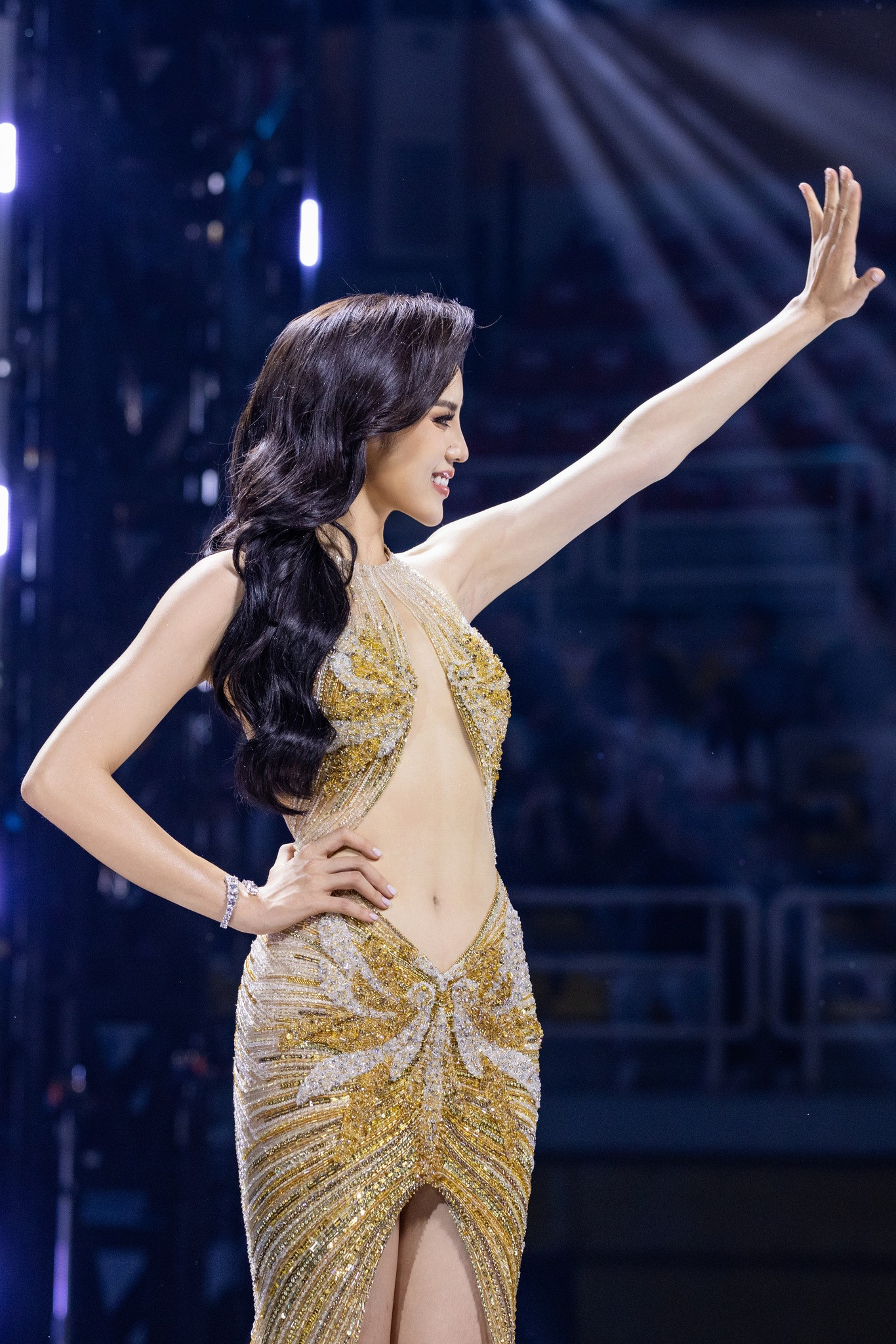 Trong đêm Chung kết Miss Universe Vietnam 2024, Kỳ Duyên đã đăng quang ngôi vị cao nhất trong bộ váy dạ hội do NTK Lê Thanh Hòa thực hiện. Trang phục có những đường cắt xẻ hiểm hóc khoe vòng eo phẳng lì, thân váy xẻ cao lộ đôi chân thon của người mặc.