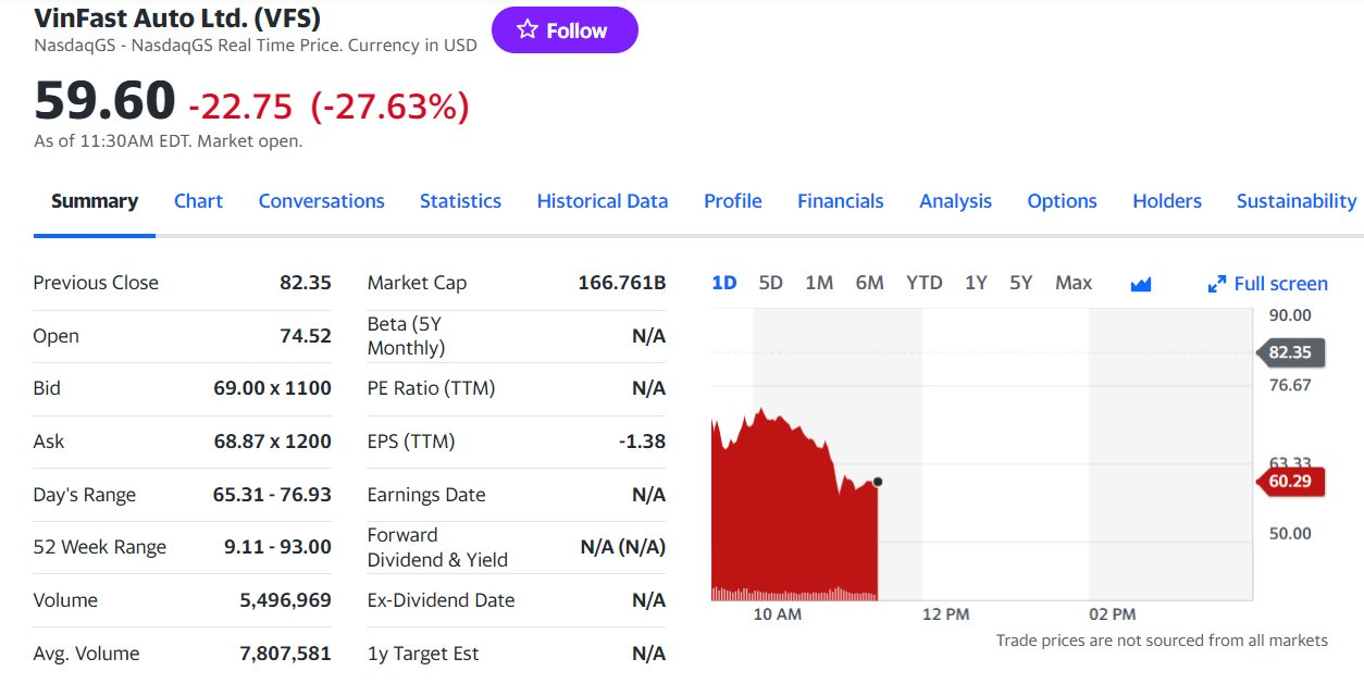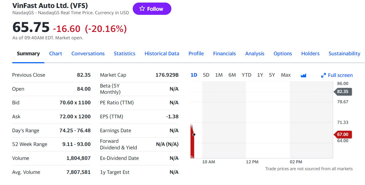 Đúng như xu hướng từ phiên Pre-market, khi bắt đầu giao dịch phiên 29/8, cổ phiếu VFS của VinFast ở mức giá 75,25 USD/cp, giảm 8,6% so với ngày 28/8. Chỉ sau vài phút, trước áp lực chốt lời lớn sau chuỗi 6 phiên tăng, cổ phiếu VFS đã giảm đến hơn 20% còn hơn 65 USD/cp. Vốn hóa thị trường của hãng xe điện này giảm còn 151 tỷ USD.