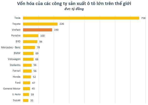 Thậm chí, vốn hóa của VinFast còn vượt hai đối thủ xếp sau là Porsche và BYD cộng lại. Mức giá cao nhất trong ngày lên đến 93 USD, tương ứng vốn hóa đạt 215 tỷ USD - xấp xỉ vốn hóa của Toyota.