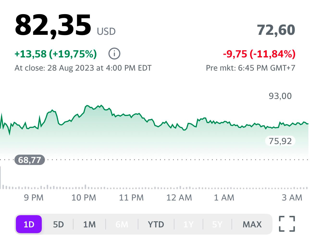 Trước đó, vào lúc 7h45 ngày 29/8 tại Mỹ, tức 18h45 tại Việt Nam, cổ phiếu VFS trong phiên giao dịch trước giờ mở cửa (Pre-market) đã giảm 12% so với hôm trước còn 72,6 USD/cp. Đây có thể là một chỉ báo cho thấy trong phiên ngày hôm nay cổ phiếu VFS sẽ giảm. Trong các phiên giao dịch trước, cổ phiếu VFS đều tăng phi mã ngày trước giờ giao dịch chính thức.