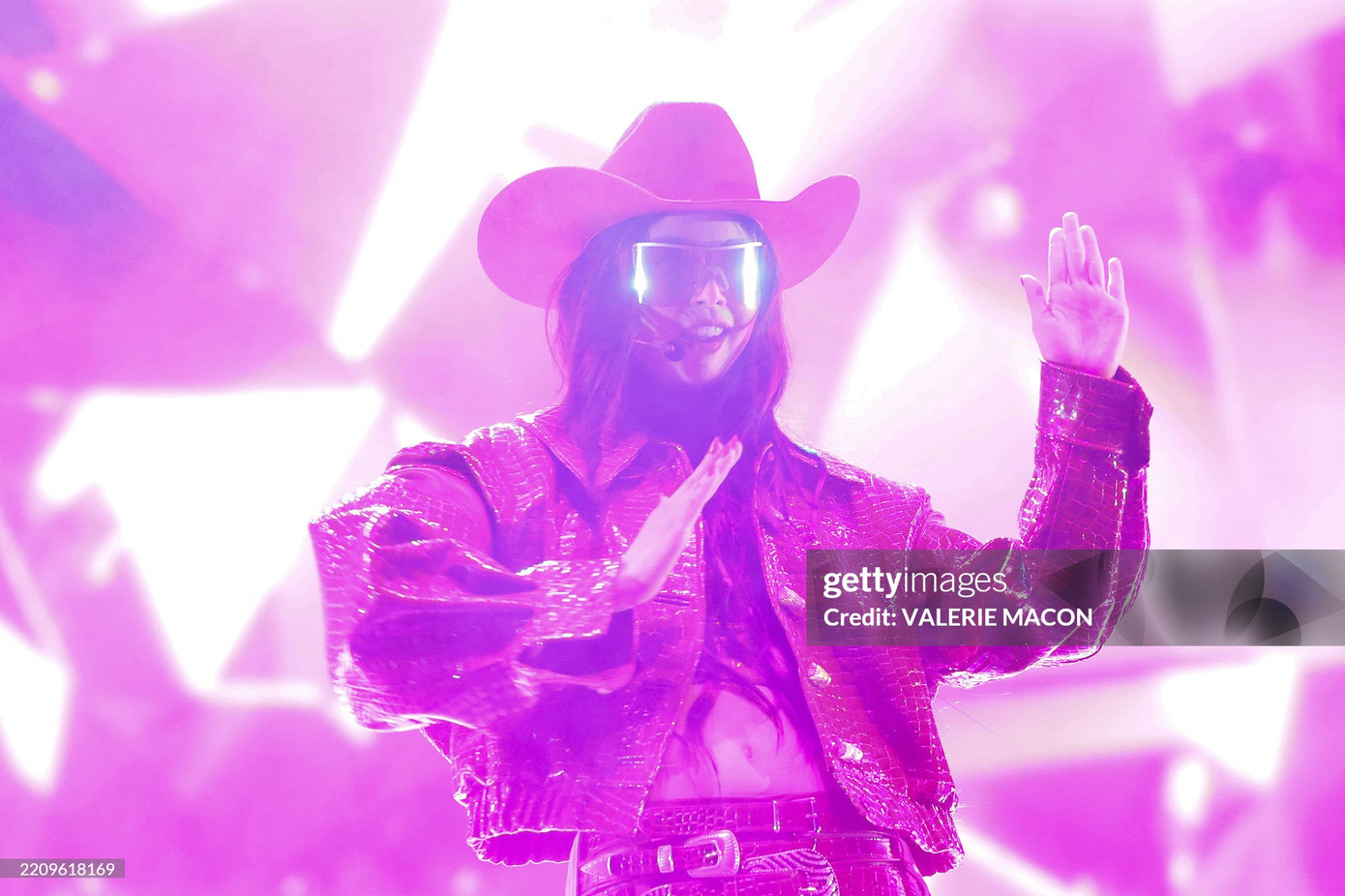 Thiết kế mũ cowboy, kính râm avant-garde từ Acne Studios đã được “nhá hàng” trước, phối cùng bốt đùi da lộn màu be, áo khoác bomber da sần giúp hoàn thiện tạo hình mở màn của Jennie BLACKPINK.