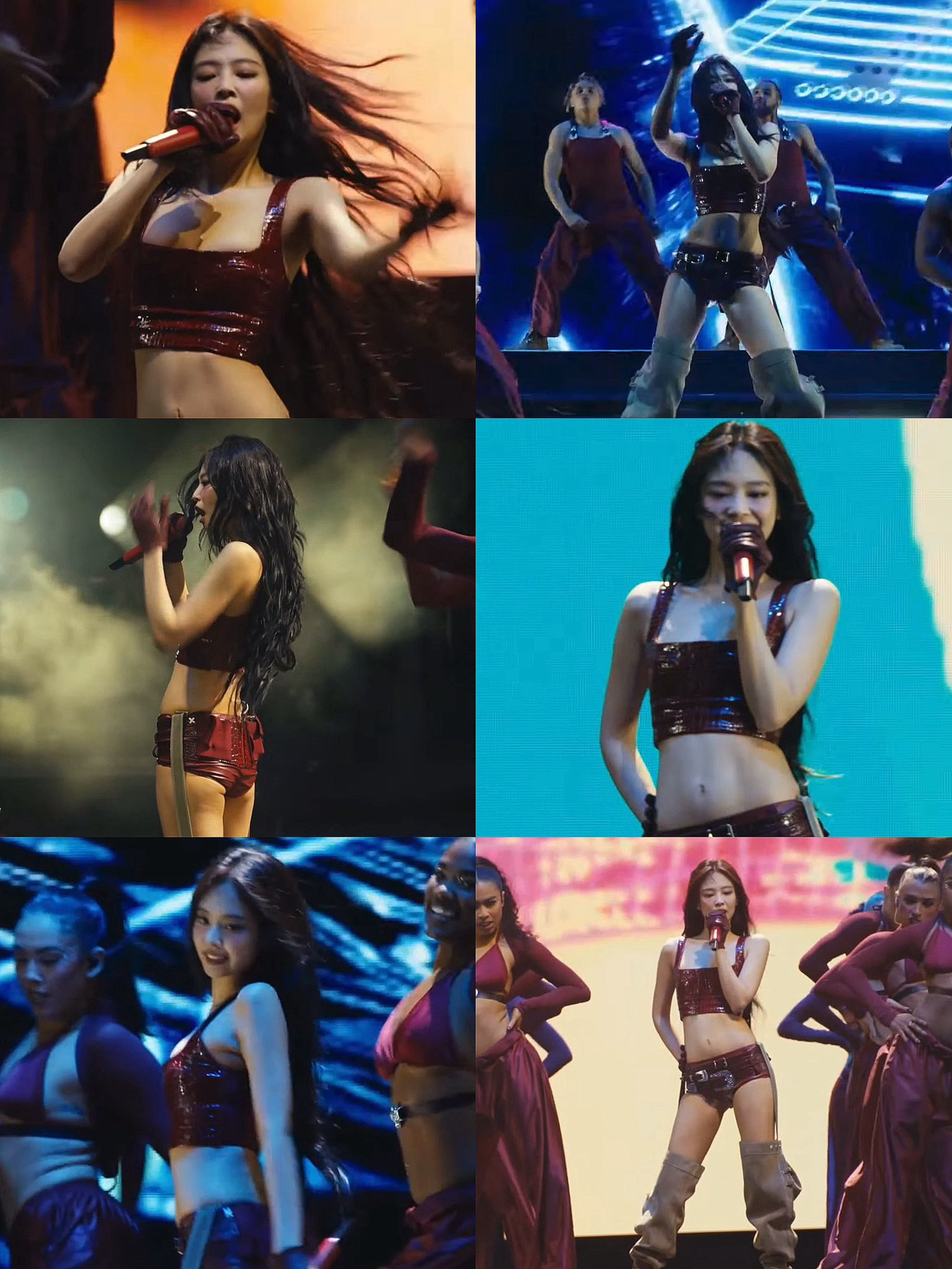 Jennie BLACKPINK chọn chủ đề trang phục tông đỏ trầm trong suốt màn trình diễn. Nữ idol sinh năm 1996 không thay đổi một lần toàn bộ outfit mà thêm thắt phụ kiện để tạo ra diện mạo mới lạ phù hợp với từng ca khúc.