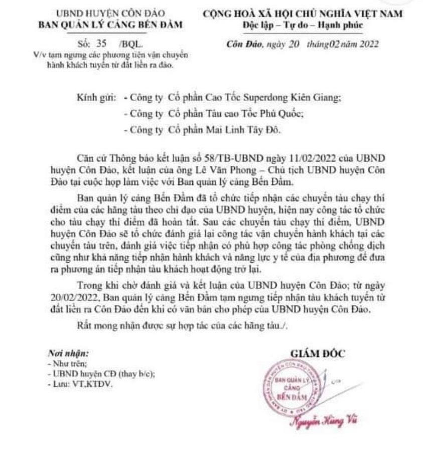 Cũng theo công văn trên, trong khi chờ đánh giá và kết luận của UBND huyện Côn Đảo, từ ngày 20/2 Ban quản lý cảng Bến Đầm sẽ ngưng tiếp nhận tàu khách tuyến từ đất liền ra Côn Đảo cho tới khi có văn bản cho phép của UBND huyện Côn Đảo.