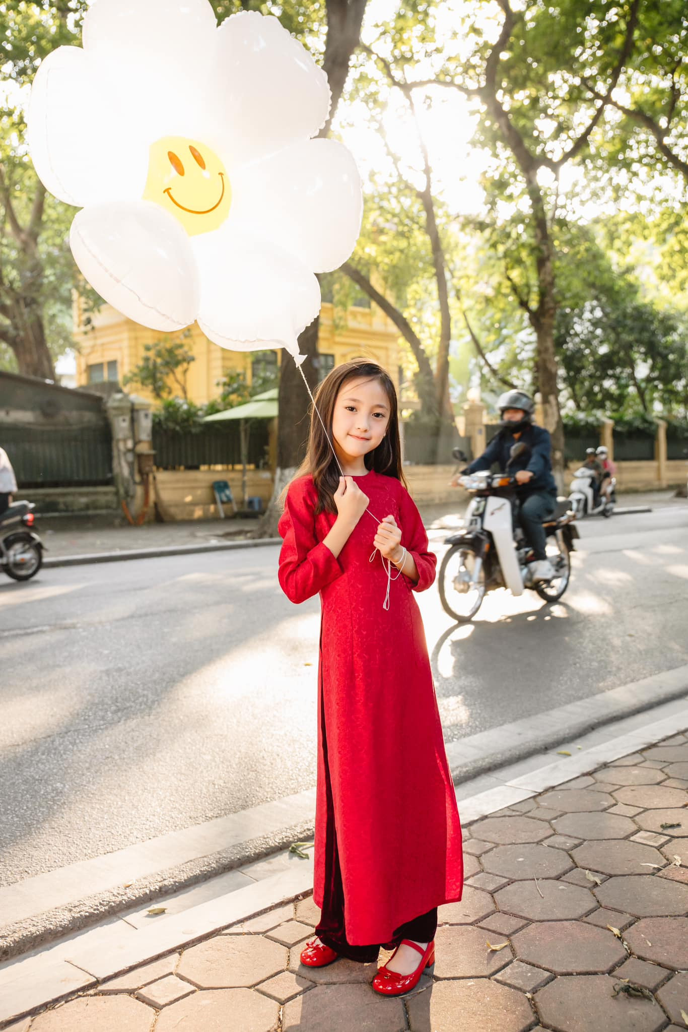 Nếu Hoa hậu Đặng Thu Thảo chọn áo dài hồng rực cho hai mẹ con thì Hoa hậu Hà Kiều Anh lại chọn tông đỏ rực rỡ khi xuống phố. Cô cùng với con gái Viann đã diện đồ đôi toàn tập, từ áo dài đến giày khi thực hiện bộ ảnh đón Xuân.