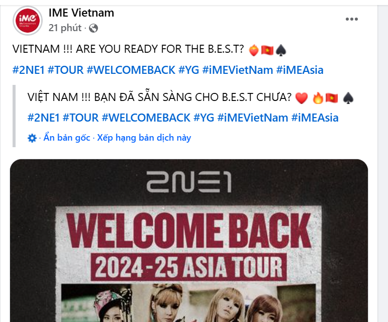 Đơn vị tổ chức concert của 2NE1 tại TP.HCM cũng giống với bên tổ chức concert của BLACKPINK tại Hà Nội vào năm ngoái, concert của Chanyeol, SUPER JUNIOR tại TP.HCM... vừa qua. Vì vậy, nền tảng bán vé dự kiến cũng sẽ tương tự.