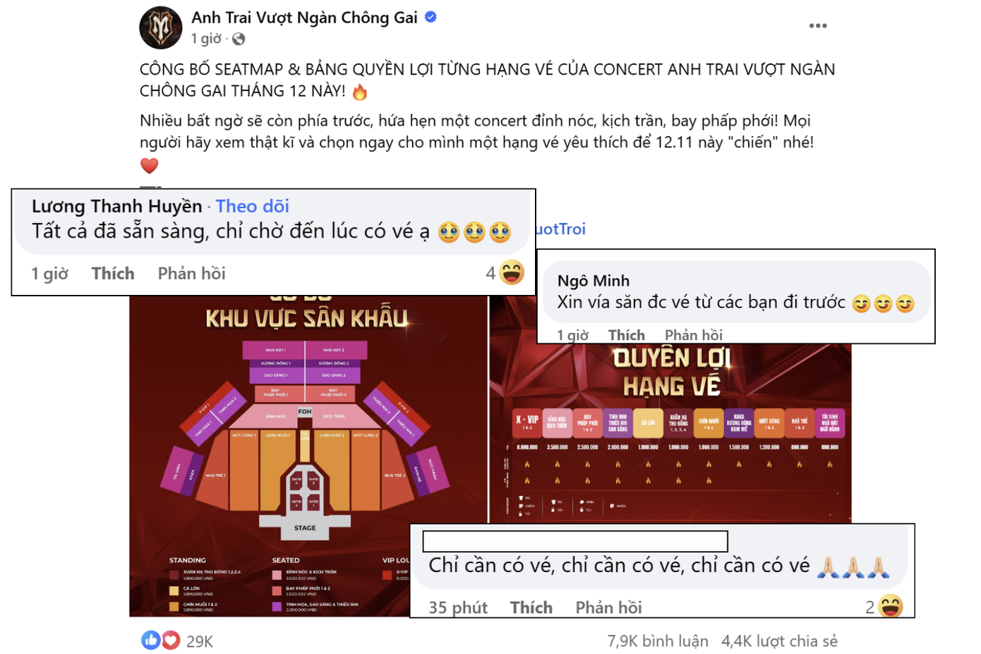Dù vậy, ưu tiên hàng đầu của các “Gai Con” vẫn là có được vé. Lượng tương tác lớn trong bài đăng công bố seatmap đã phản ánh những "chông gai" của "cuộc chiến" lần này. Vé concert sẽ chính thức mở bán vào 10 giờ sáng ngày 12/11 và fan đã chuẩn bị tâm lý sẵn sàng cho cuộc đua “săn vé” đầy cam go.