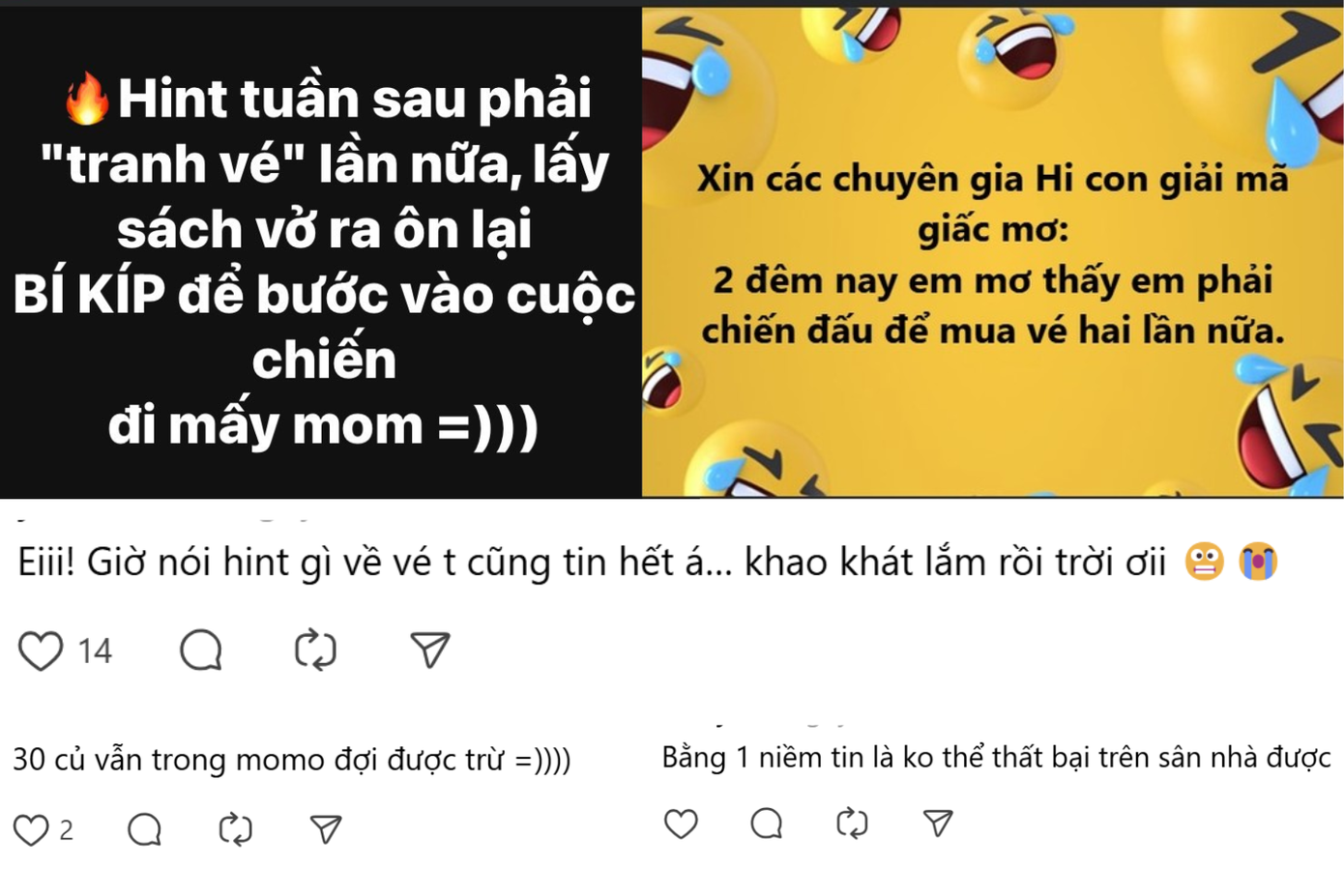 Trong khi đó, các “Hi mẹ” kỳ cựu không quên động viên lẫn nhau với bình luận: “Hãy cứ tin! Tranh lần nữa còn hơn không được tranh”. Một số người còn hài hước chia sẻ: “Từng chiến qua hàng loạt concert quốc tế mà giờ săn vé trong nước lại trượt, lần này nhất định phải thắng trên sân nhà”.