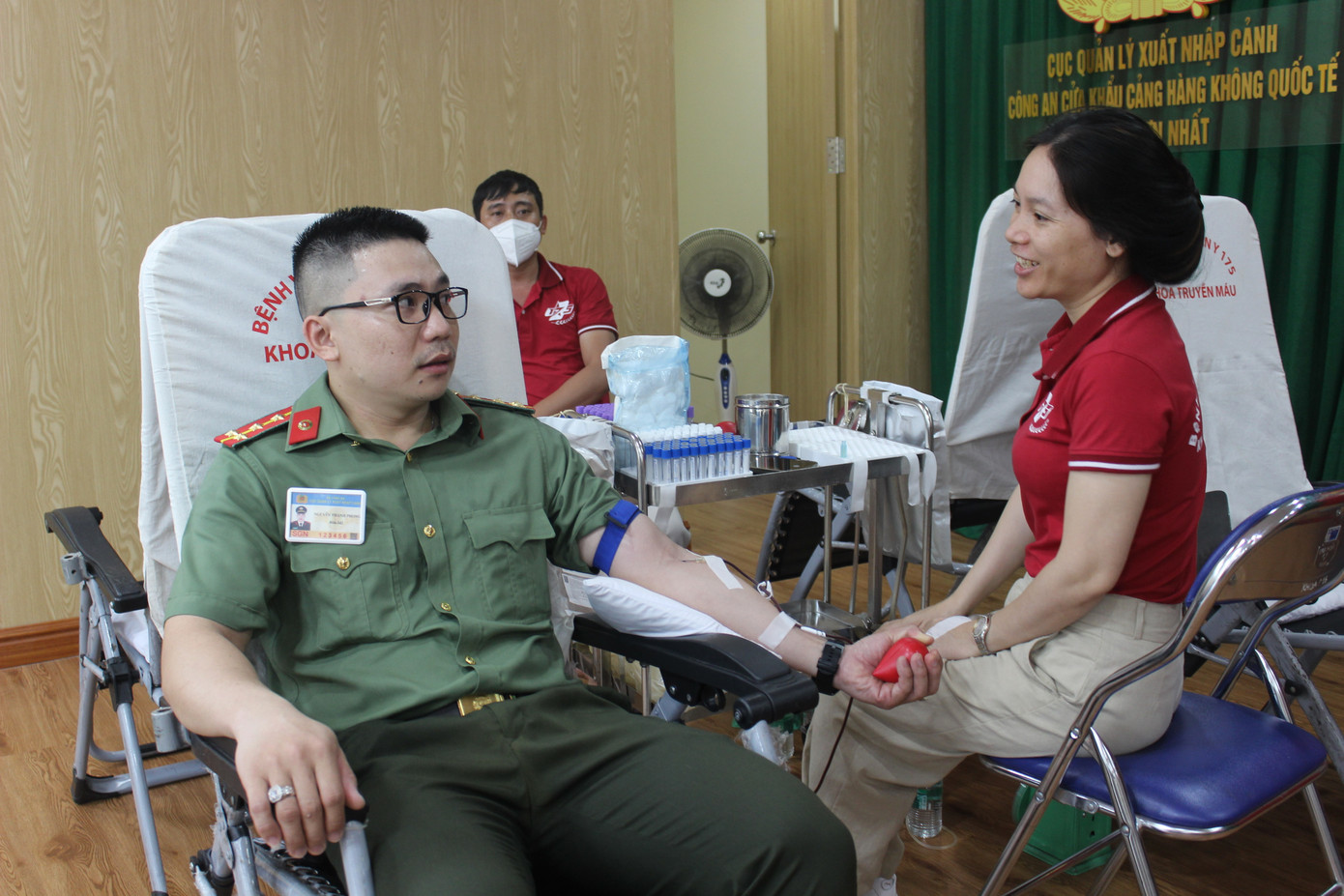 | Trung tá Hà Hải Minh - Phó trưởng Công an cửa khẩu cảng hàng không quốc tế Tân Sơn Nhất tham gia hiến máu cùng chương trình. |