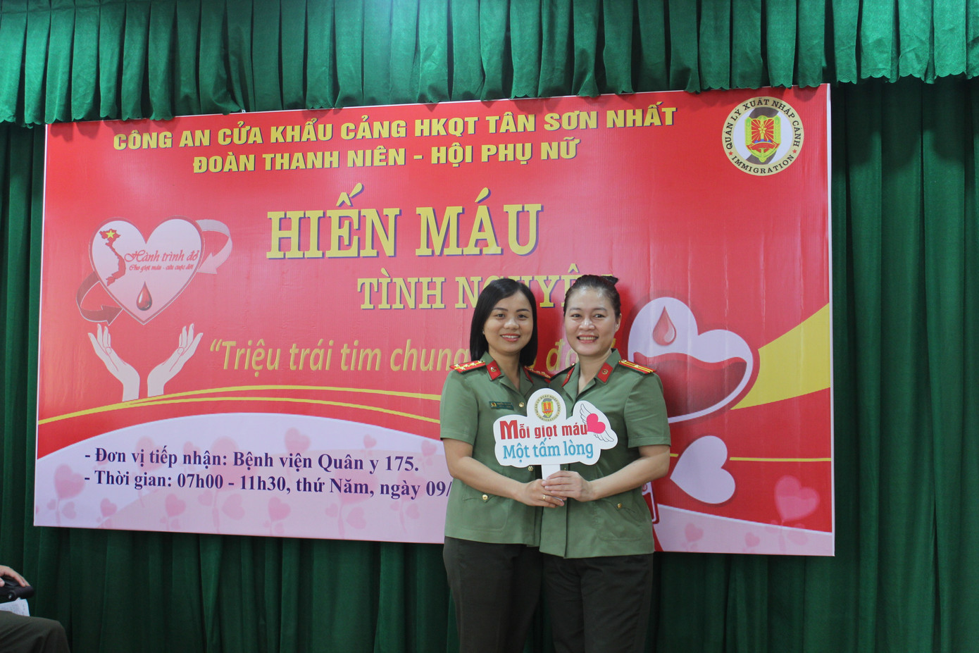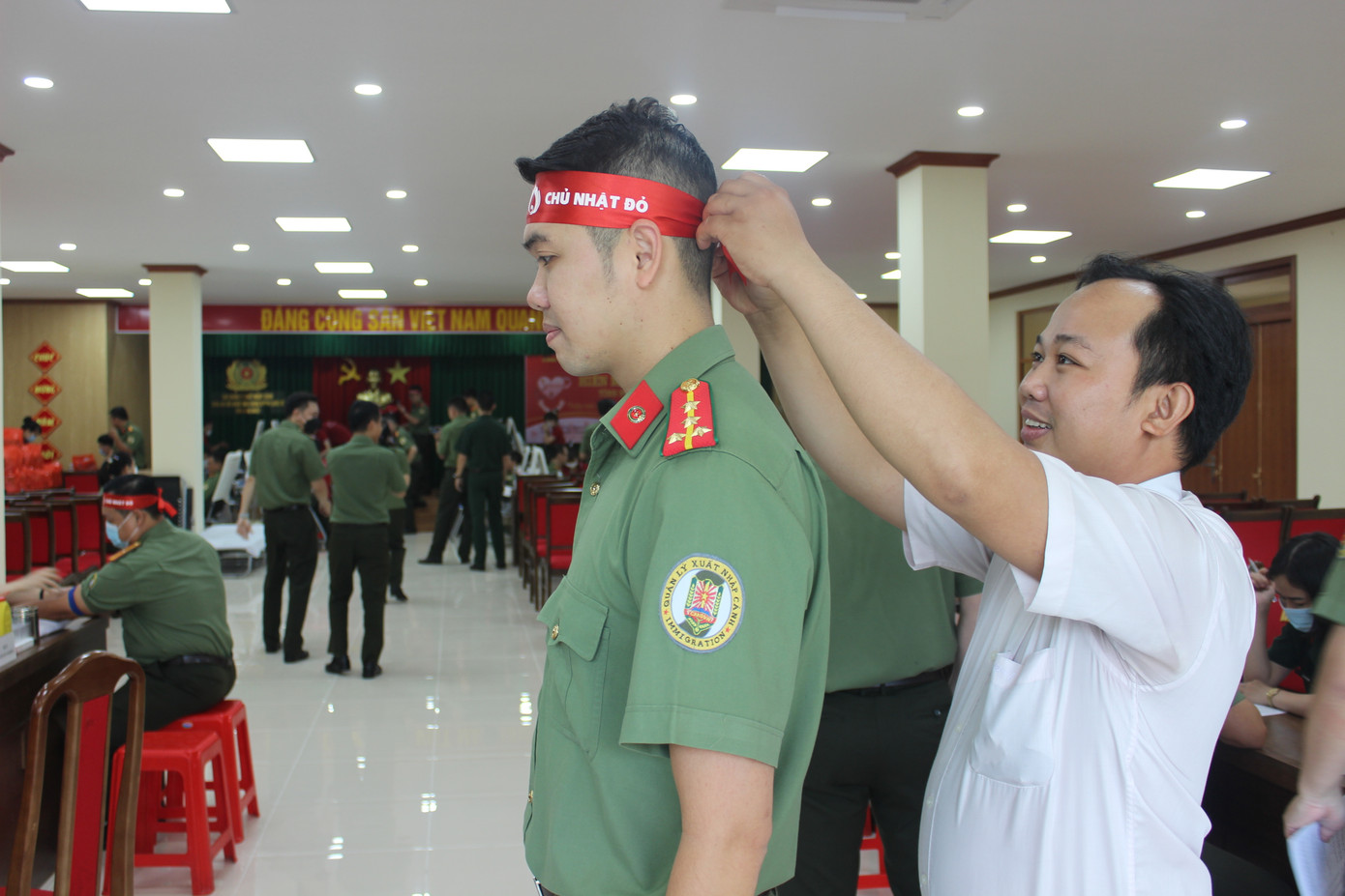 | Trung tá Đỗ Văn Hào - Phó trưởng Công an cửa khẩu cảng hàng không quốc tế Tân Sơn Nhất (tư ba bên phải) cho biết: “Khi nhận được kế hoạch hiến máu tình nguyện Chủ nhật Đỏ, cấp ủy đã nhiệt tình ủng hộ. Đây là hoạt động tạo thêm động lực cho các cán bộ, chiến sĩ cơ quan trong năm 2023 để hoàn thành tốt nhiệm vụ. Đồng thời, hoạt động cũng thể hiện tinh thần sẻ chia của người chiến sĩ công an. Tôi mong rằng, Đoàn Thanh niên cơ quan sẽ phối hợp làm tốt nhiều các hoạt động như này”. |