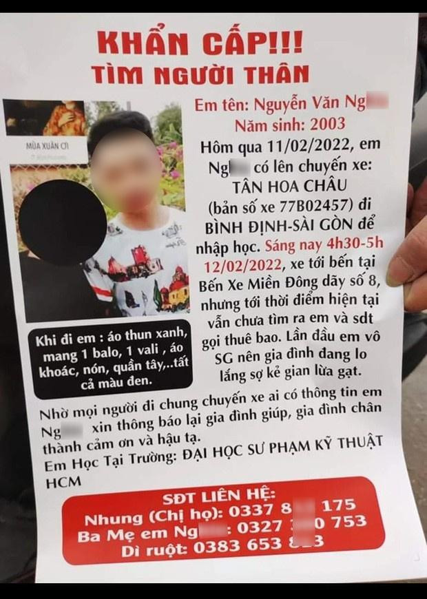 Theo xác minh, khoảng 5h sáng 12/2, xe khách Tân Hoa Châu đến Bến xe Miền Đông thì gia đình không liên lạc được với Ng.