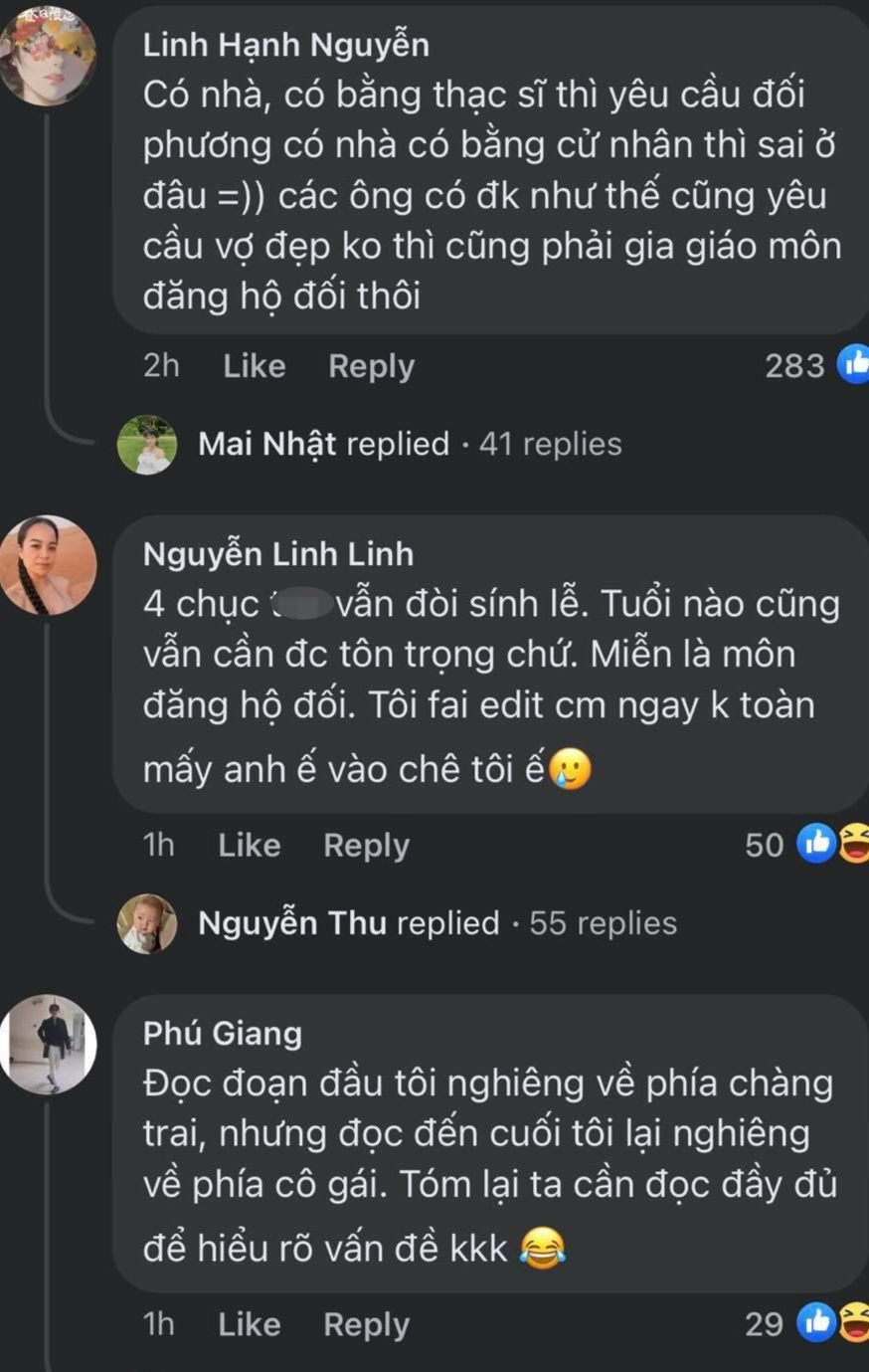 Có bình luận cho rằng: "Người ta cũng thành đạt có kinh tế, có nhà thì chuyện người ta yêu cầu đối phương phải ngang mình là chuyện bình thường."