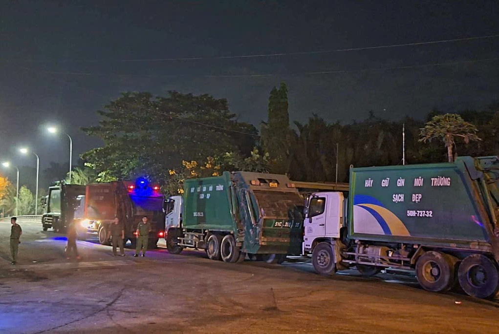 | Hàng chục chiếc xe thu gom rác xếp hàng dài trước cổng Khu liên hợp xử lý chất thải Đa Phước đêm 23/1 |