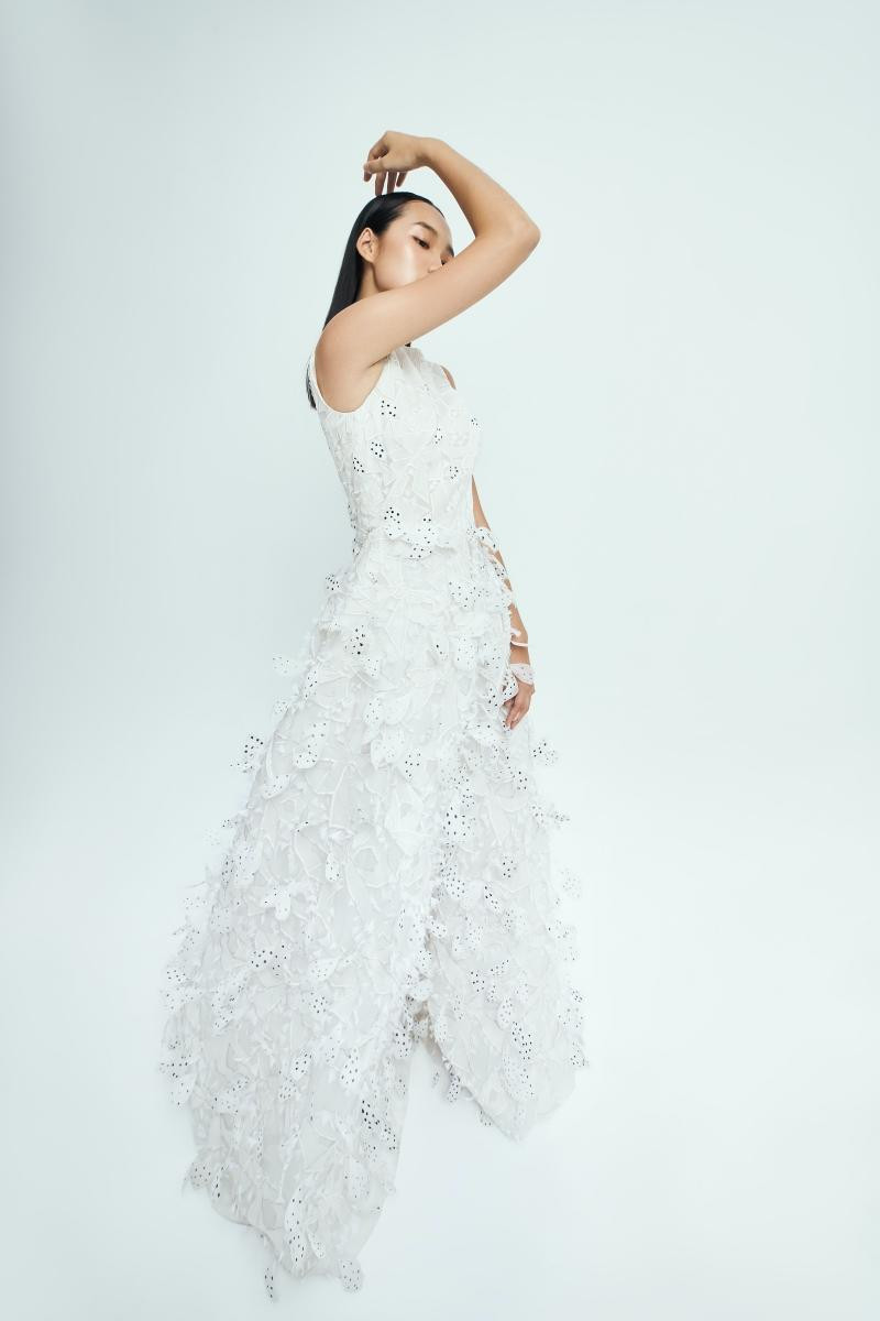 Trên nền các chất liệu cao cấp như organza, taffeta, tơ hay lụa, nhà thiết kế Công Trí áp dụng các kĩ thuật xử lí cầu kì để tạo ra bề mặt chất liệu mới, mang đến tính đột phá cho bộ sưu tập.