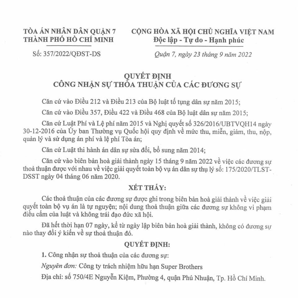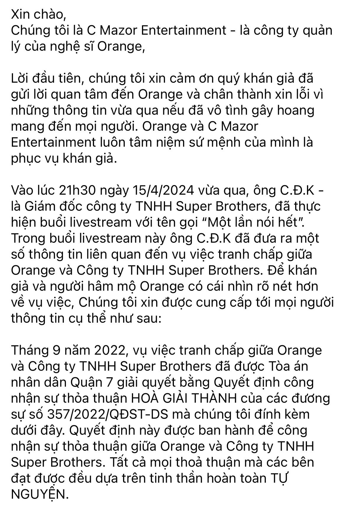 Đầu tiên, về vụ tranh chấp giữa Orange và công ty cũ, đại diện mới của nữ ca sĩ xác nhận sự việc đã được Tòa án nhân dân Quận 7, TP.HCM giải quyết bằng Quyết định công nhận sự thỏa thuận của các đương sự số 357/2022/QĐST-DS ngày 23 tháng 9 năm 2022. Trong văn bản, tòa án đã công nhận sự tự thỏa thuận của các đương sự trong quá trình hòa giải. Do đó việc Orange bị xử thua kiện và phải đền bù thiệt hại như nhạc sĩ Châu Đăng Khoa phát ngôn trong livestream là sai lệch.