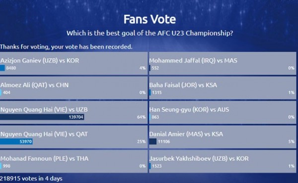 Đáng chú ý, tuyệt phẩm đá phạt của Quang Hải trong trận chung kết gặp U23 Uzbekistan đã nhận được tổng cộng 139.704 phiếu bầu, chiếm 64% tổng lượt bình chọn. Qua đó, trở thành bàn thắng đẹp nhất giải, bỏ xa bàn thắng xếp thứ 2 và cũng là siêu phẩm của chính anh trong trận gặp U23 Quatar tới 39%.