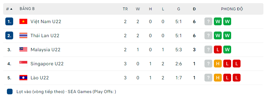 Ở bảng B, U22 Singapore và U22 Lào đã chính thức bị loại với vỏn vẹn 1 điểm sau 3 trận đấu. Cuộc đua giành vé vào bán kết chỉ còn là màn so tài giữa U22 Việt Nam, U22 Thái Lan và U22 Malaysia.