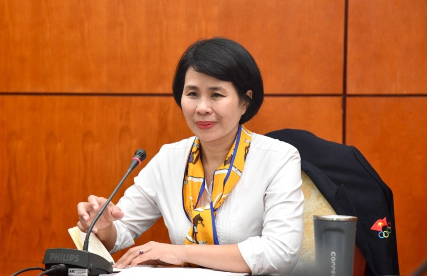 | Cục phó Cục TDTT Lê Thị Hoàng Yến trong màu áo của Tiền Phong Marathon. |