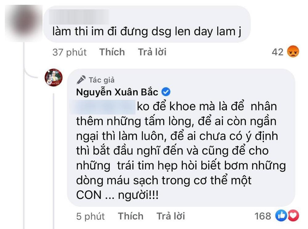 Chẳng ngờ có người lại khuyên Xuân Bắc nếu có làm từ thiện thì nên kín đáo, không phải khoe ra làm gì. Nhưng nam nghệ sĩ đã phản hồi rất khéo léo rằng anh chẳng định khoe khoang mà đăng lên như vậy để lan tỏa hành động đẹp, để ai còn chần chừ hãy làm luôn, ai chưa có ý định giúp người khác thì bắt đầu nghĩ tới, để những trái tim bớt hẹp hòi.