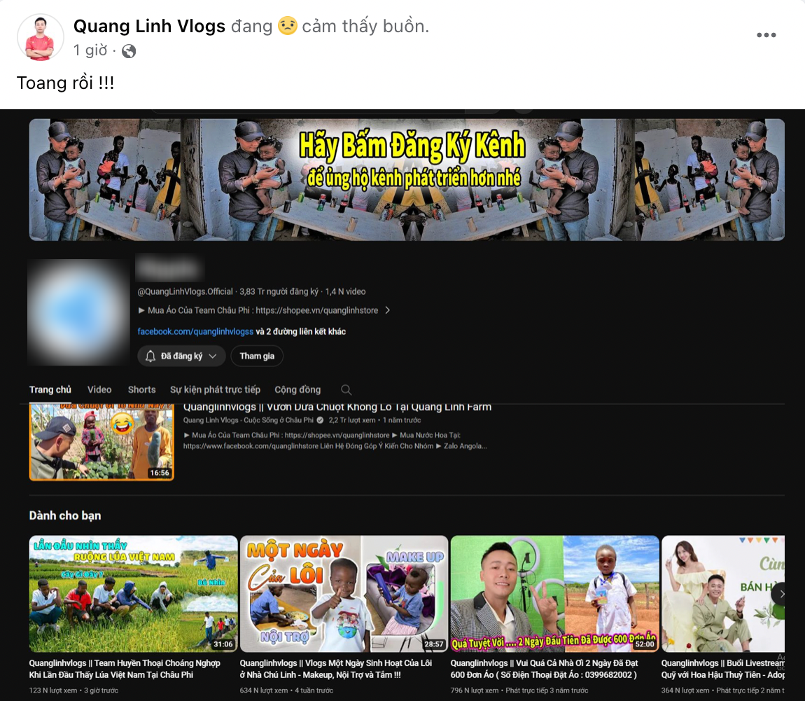 Ở một diễn biến khác, vào tối 2/4, Quang Linh Vlogs đã đăng tải trên Facebook dòng trạng thái: "Toang rồi" kèm theo hình ảnh kênh YouTube của mình bị hacker chiếm sóng. Đáng chú ý, hình ảnh này giống hệt như tình trạng kênh YouTube của Độ Mixi trong buổi sáng cùng ngày.