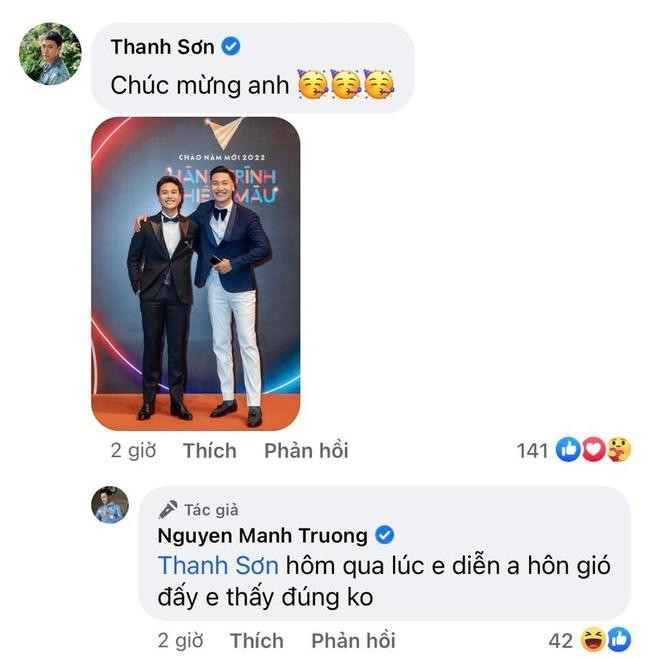 Đâu có ngờ Mạnh Trường "thả thính" lại ngọt ngào không kém khi hỏi Thanh Sơn lúc đang biểu diễn trên sân khấu có nhìn thấy Mạnh Trường hôn gió hay không. Trước đây, Thanh Sơn và Mạnh Trường đã nhiều lần bày tỏ tình cảm thân thiết trên trang cá nhân khiến khán giả vô cùng thích thú và chỉ mong hai nam diễn viên sớm gặp lại trong một dự án phim mới.