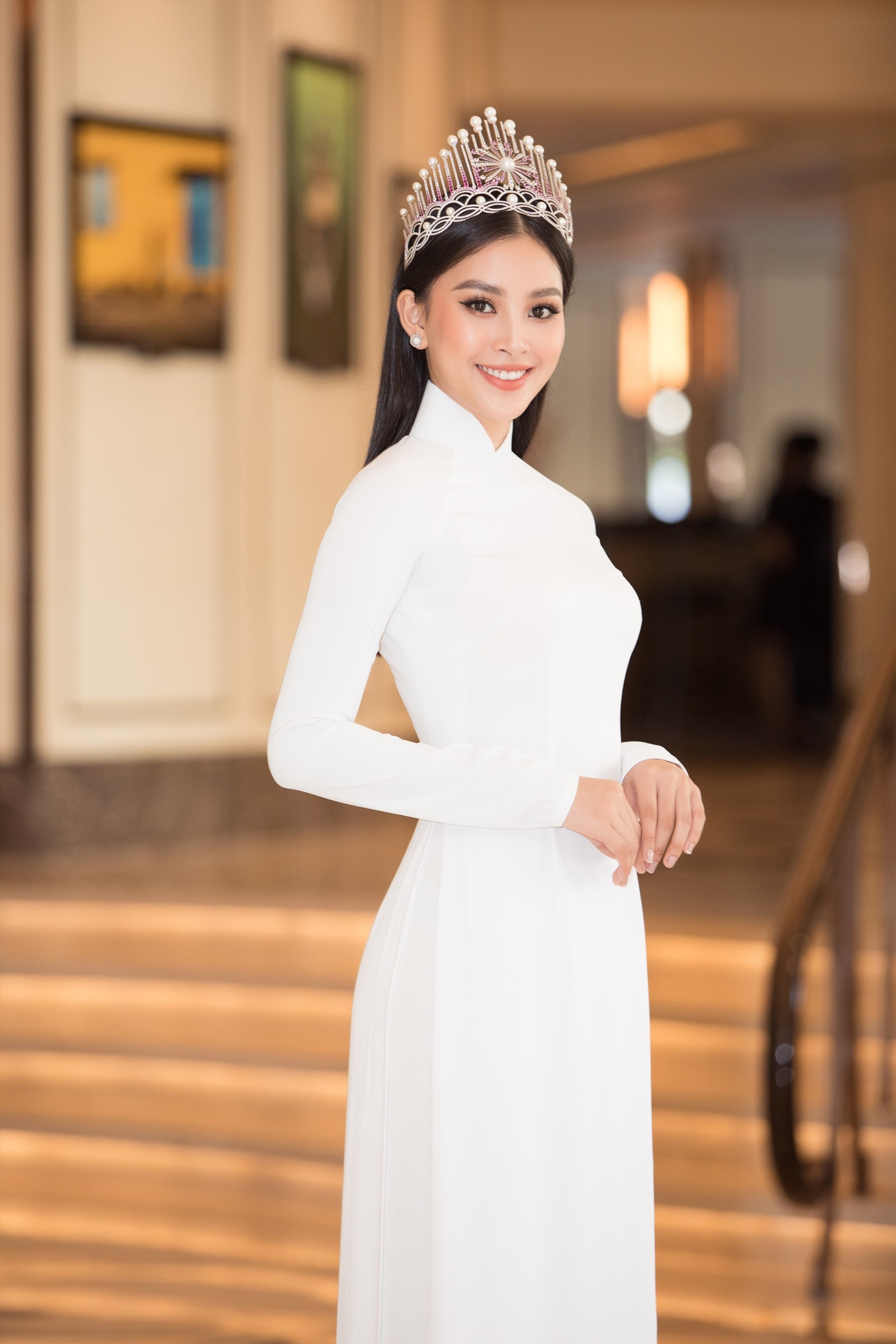 Hoa hậu Tiểu Vy rất khéo léo chọn chất liệu dày dặn nên bộ áo dài trắng mềm mại, khoe khéo đường cong chữ S của nàng hậu mà vẫn đảm bảo độ kín đáo, không bị lộ vết hằn nội y hay các sự cố tương tự.