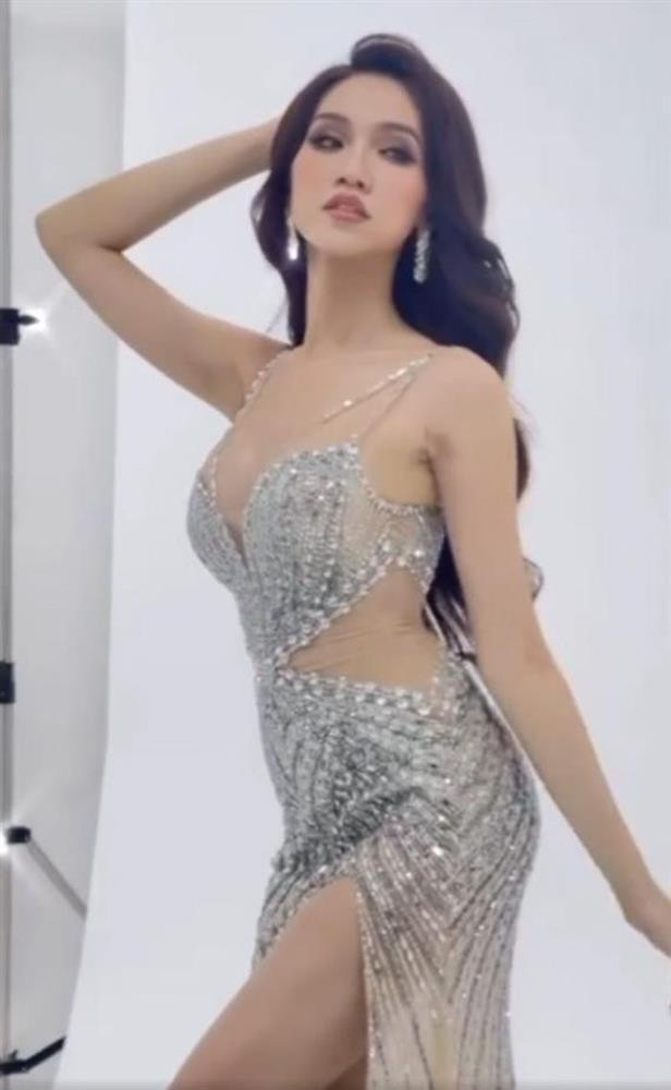 Có thể nói, những mẫu đầm lấp lánh gợi liên tưởng đến nàng tiên cá ngoi lên từ dưới mặt nước rất hợp với vẻ đẹp của Thùy Tiên. Như trong một chương trình thời trang thuộc khuôn khổ cuộc thi Hoa hậu Thế giới Việt Nam 2022, 'nàng Hậu' bước ra sân khấu với một mẫu váy khoét sâu, xẻ cao đính đá lấp lánh.