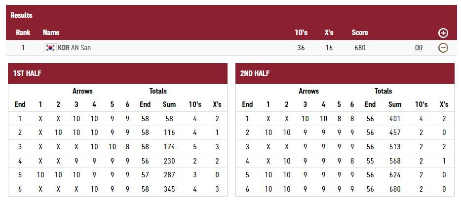 Hàn Quốc là cường quốc môn bắn cung và điều này được thể hiện ngay trong ngày ra quân của đội tuyển bắn cung nước này ở Olympic Tokyo 2020. Cụ thể, nữ cung thủ 20 tuổi An San đã lập kỷ lục Olympic với số điểm 680/720 điểm tối đa sau 72 phát bắn. Mỗi cung thủ bắn 72 mũi tên, trúng hồng tâm là 10 điểm. Điểm số chung cuộc sẽ là tổng điểm của mỗi mũi tên.Thành tích này vượt qua cột mốc 673 điểm do Lina Herasymenko của Ukraine thiết lập vào năm 1996.