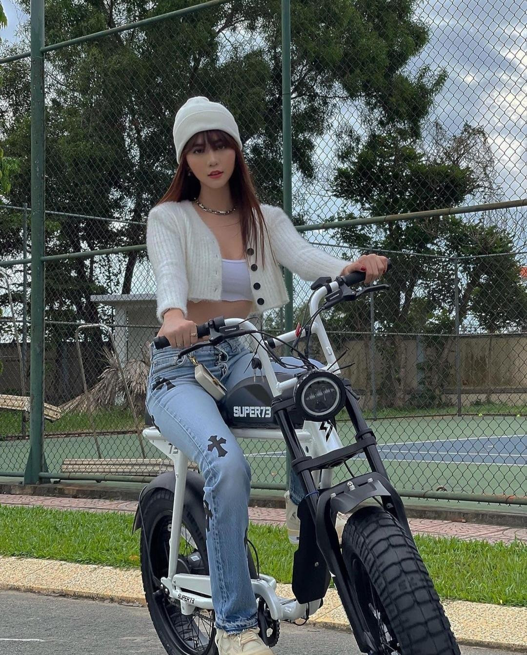 Ngọc Trinh khiến netizen bàn tán xôn xao khi diện cả cây hàng hiệu đắt đỏ với phong cách như một idol K-Pop, chiếc quần jeans Chrome Hearts tôn lên vòng eo con kiến có giá gần 100 triệu đồng, ngay cả chiếc xe đạp điện mà cô nàng sử dụng cũng có giá khoảng 60 triệu.