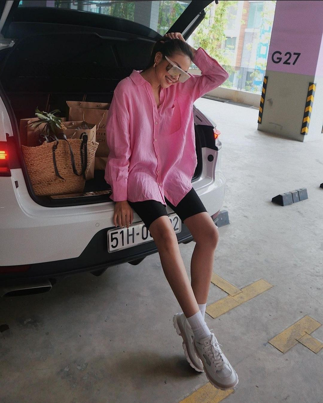 Hết chụp ảnh cùng xe đạp, Thanh Hằng chuyển sang tạo dáng với cốp xe hơi, một cách chụp ảnh hay ho giúp khoe chân dài. Siêu mẫu diện áo sơ mi hồng cùng quần legging lửng, đi giày sneaker phong cách menswear năng động.