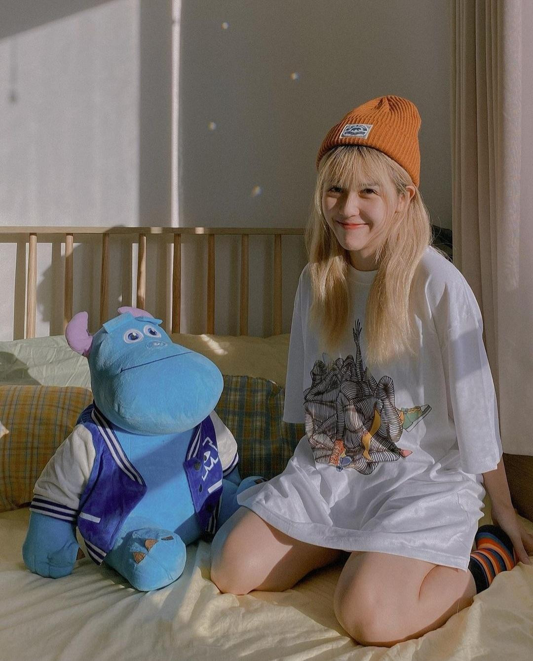 Hậu Hoàng trẻ trung, đáng yêu như nữ sinh với trend chụp cùng ánh nắng, cô nàng mặc áo phông in hình, kiểu dáng oversized theo mốt giấu quần, đội mũ và đi tất len tone-sur-tone.
