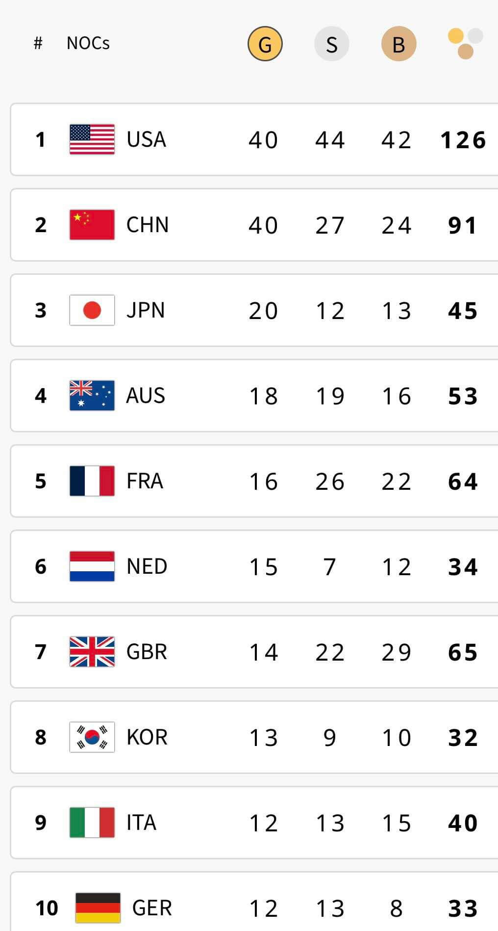 Trước trận chung kết giữa Mỹ và Pháp vào lúc 20h30, Trung Quốc đã có 40 HCV sau chiến thắng vang dội của Li Wenwen. Cô đem về tấm HCV thứ 40 cho Trung Quốc khi dẫn đầu chung kết cử tạ hạng +81kg nữ với tổng cử 309kg, hơn người xếp thứ 2 tới 10kg. Đây là tấm HCV cuối cùng của quốc gia này ở Paris 2024.