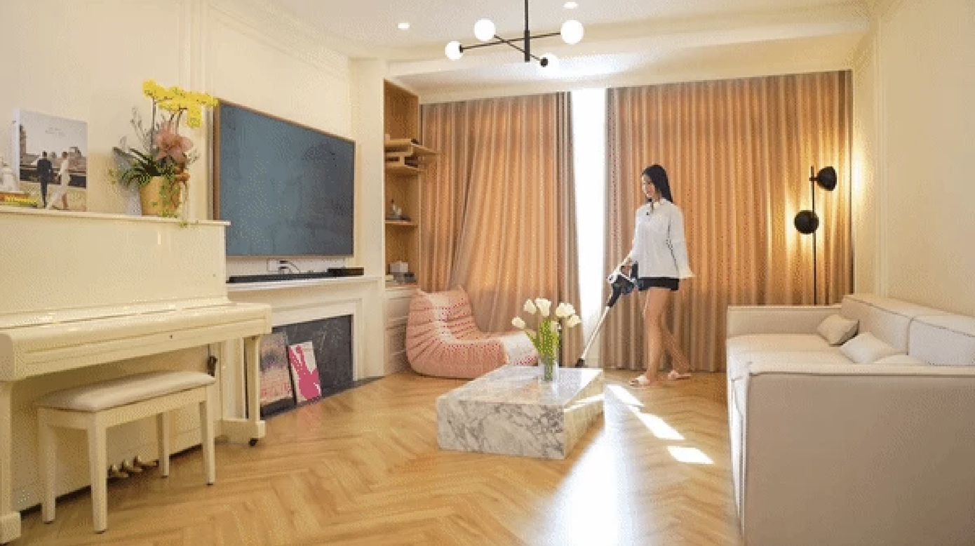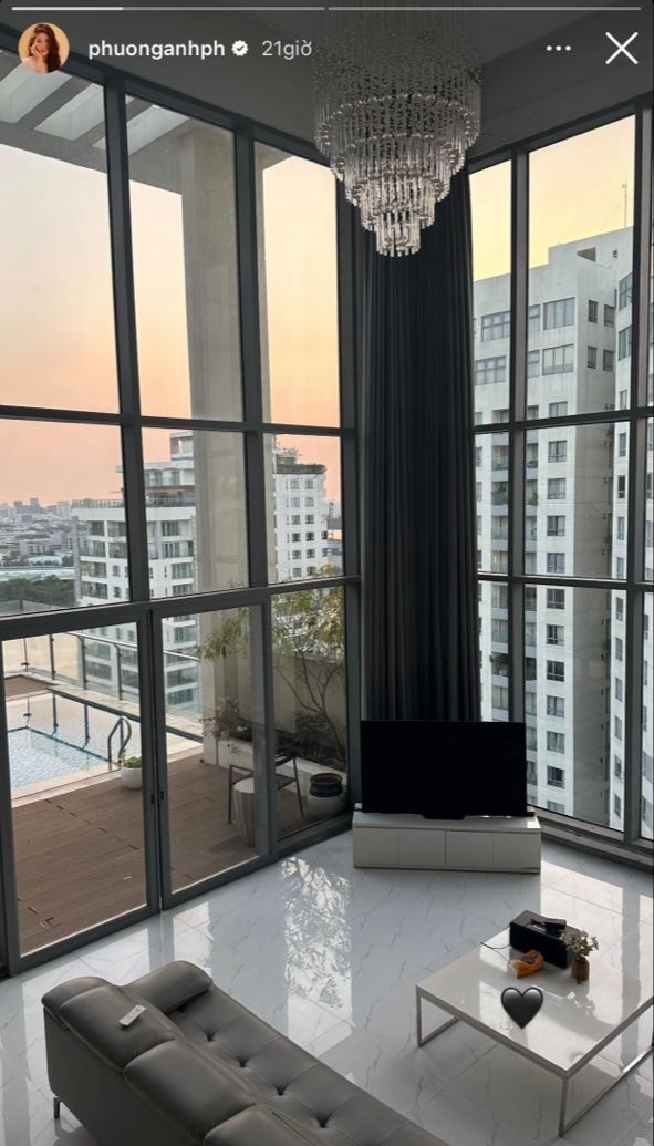 Nàng hậu cùng chồng hiện sống trong một căn penthouse 2 tầng, rộng 150m2. Không gian sống sang trọng mang tông màu trắng nhã nhặn, là ý tưởng thiết kế của cặp vợ chồng son.