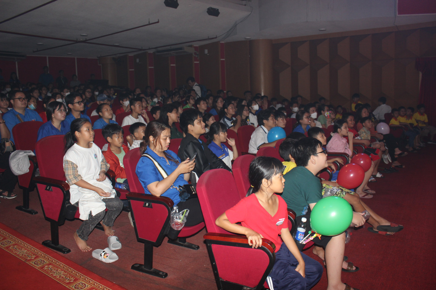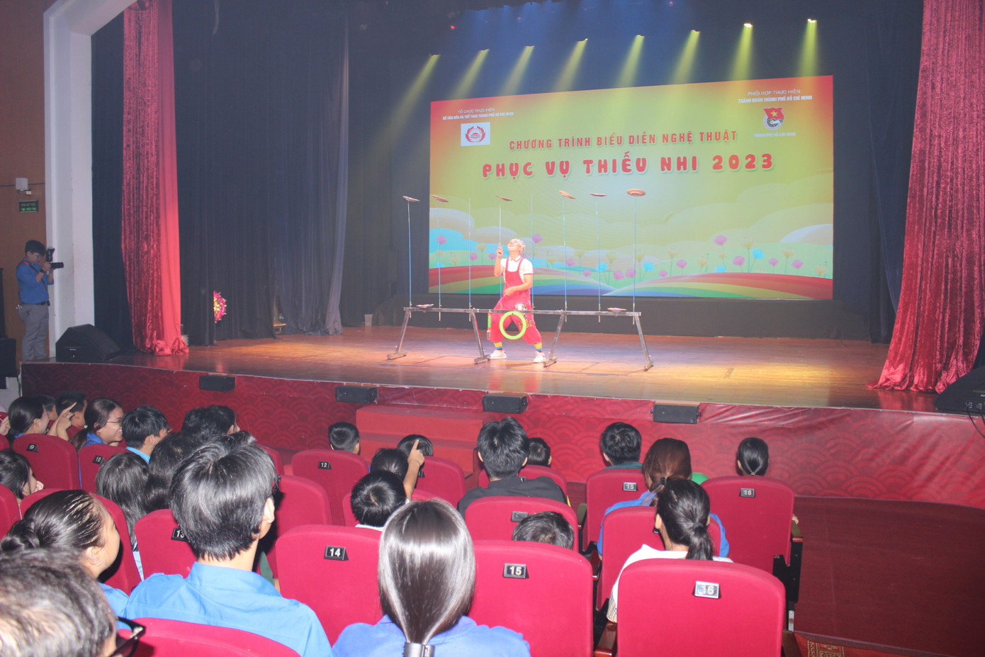 | Điểm cuối của hành trình là Nhà hát Cải lương Trần Hữu Trang (quận 1). Tại đây, các em được xem các tiết mục xiếc, văn nghệ thiếu nhi. |