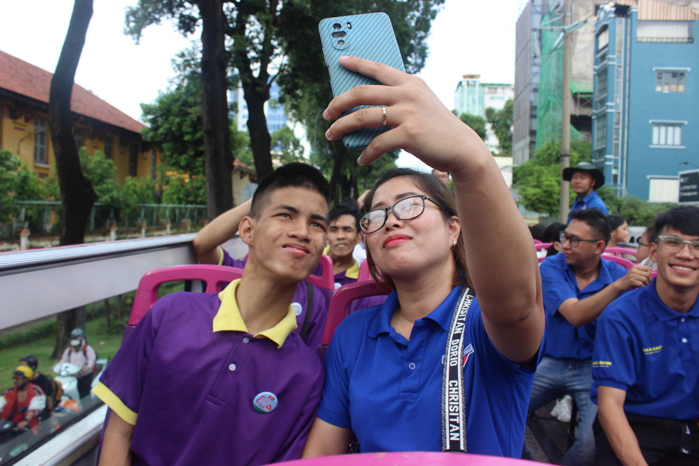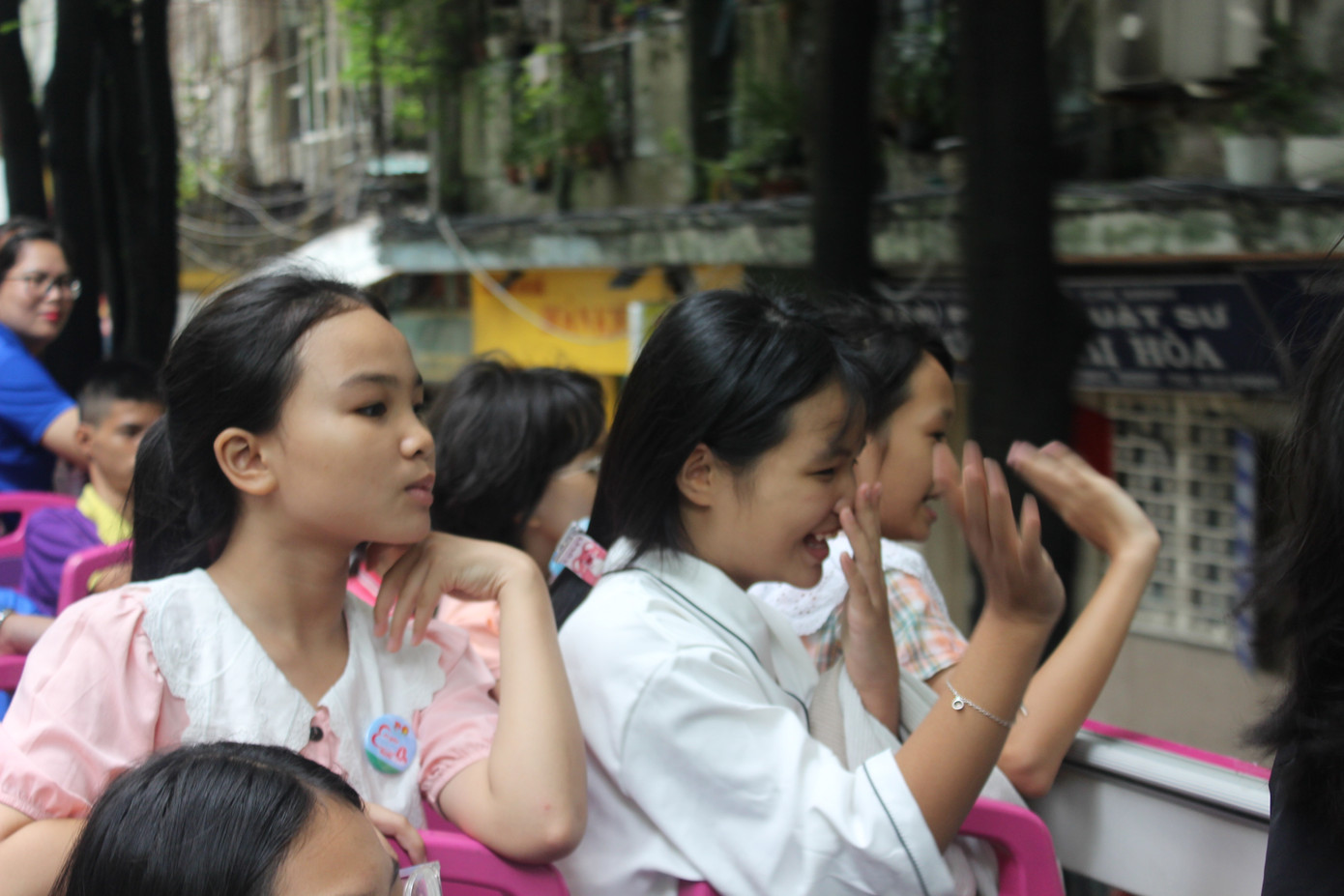 | Nhiều em thiếu nhi lần đầu được trải nghiệm xe buýt 2 tầng nên rất thích thú. |