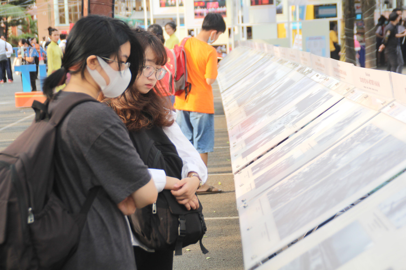 | Bạn trẻ chăm chú xem các bức ảnh tư liệu lịch sử trong khuôn khổ Ngày sách Việt Nam |