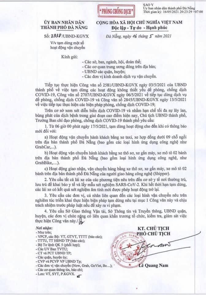 Ngoài việc tạm dừng hoạt động của shipper, Đà Nẵng cũng tạm dừng hoạt động vận chuyển hành khách bằng xe taxi, xe hợp đồng dưới 9 chỗ ngồi trên địa bàn thành phố, bao gồm luôn các loại hình xe ứng dụng công nghệ như Grab Car...