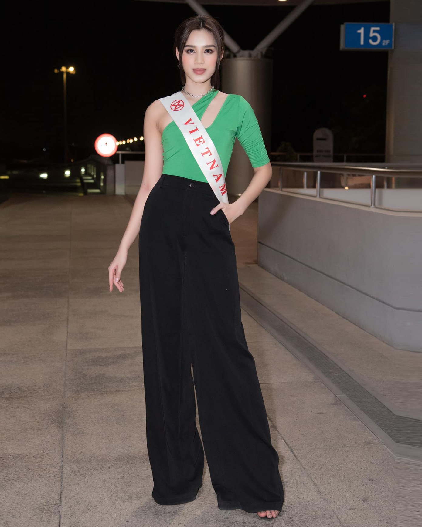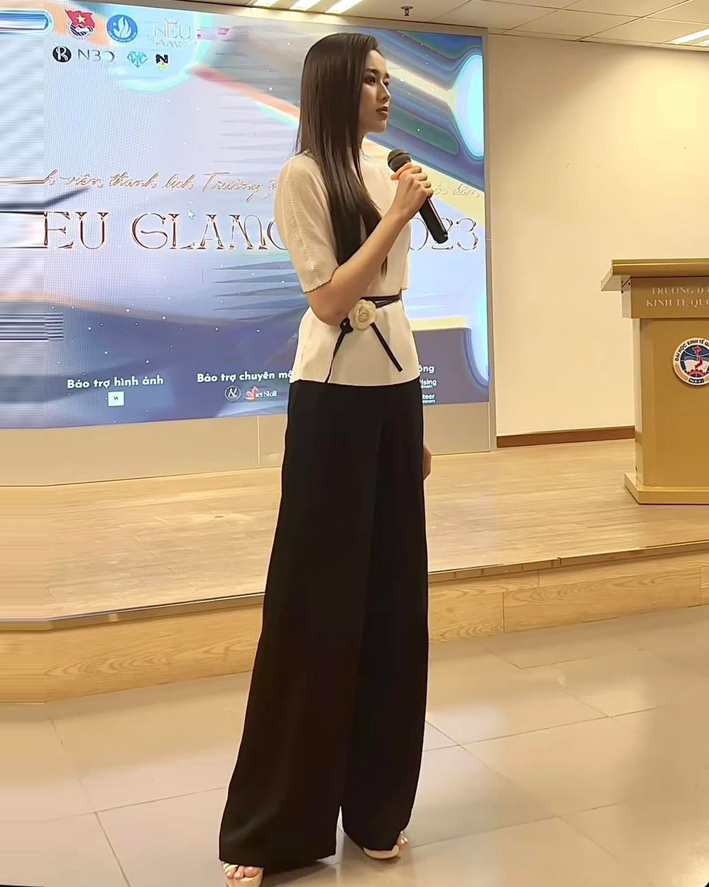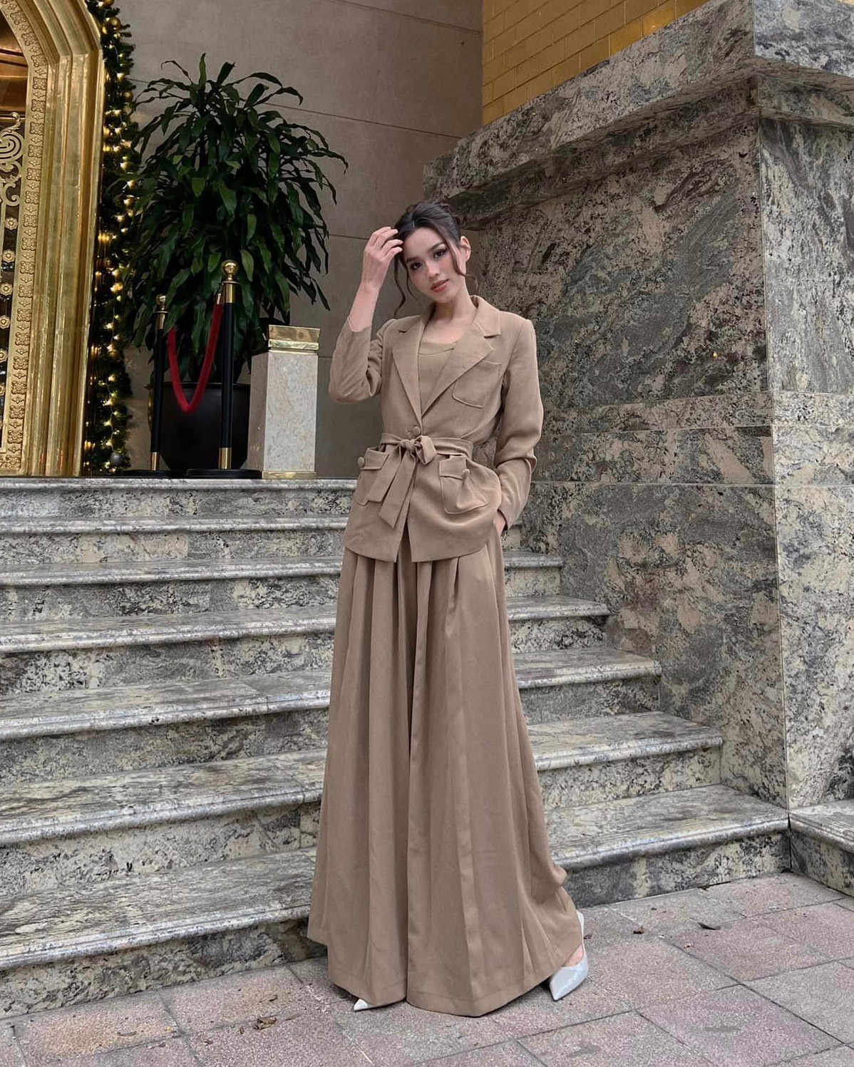 Thậm chí nàng hậu còn không ngại những mẫu quần siêu rộng, thoạt nhìn sẽ tưởng là cô đang diện váy. Đỗ Thị Hà cũng phối đồ rất khéo khi cô luôn nhớ chi tiết thắt eo, giúp tạo điểm nhấn cho trang phục.