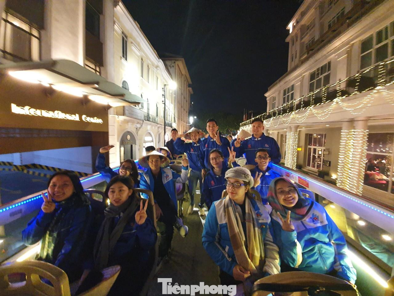 | 19h, các đại biểu đến từ nhiều tỉnh thành như Đắk Lắk, Thái Bình, Nam Định, Lào Cai... di chuyển đến Nhà hát lớn Hà Nội lên xe buýt hai tầng tham quan các địa điểm danh thắng nội thành thành phố Hà Nội. |
