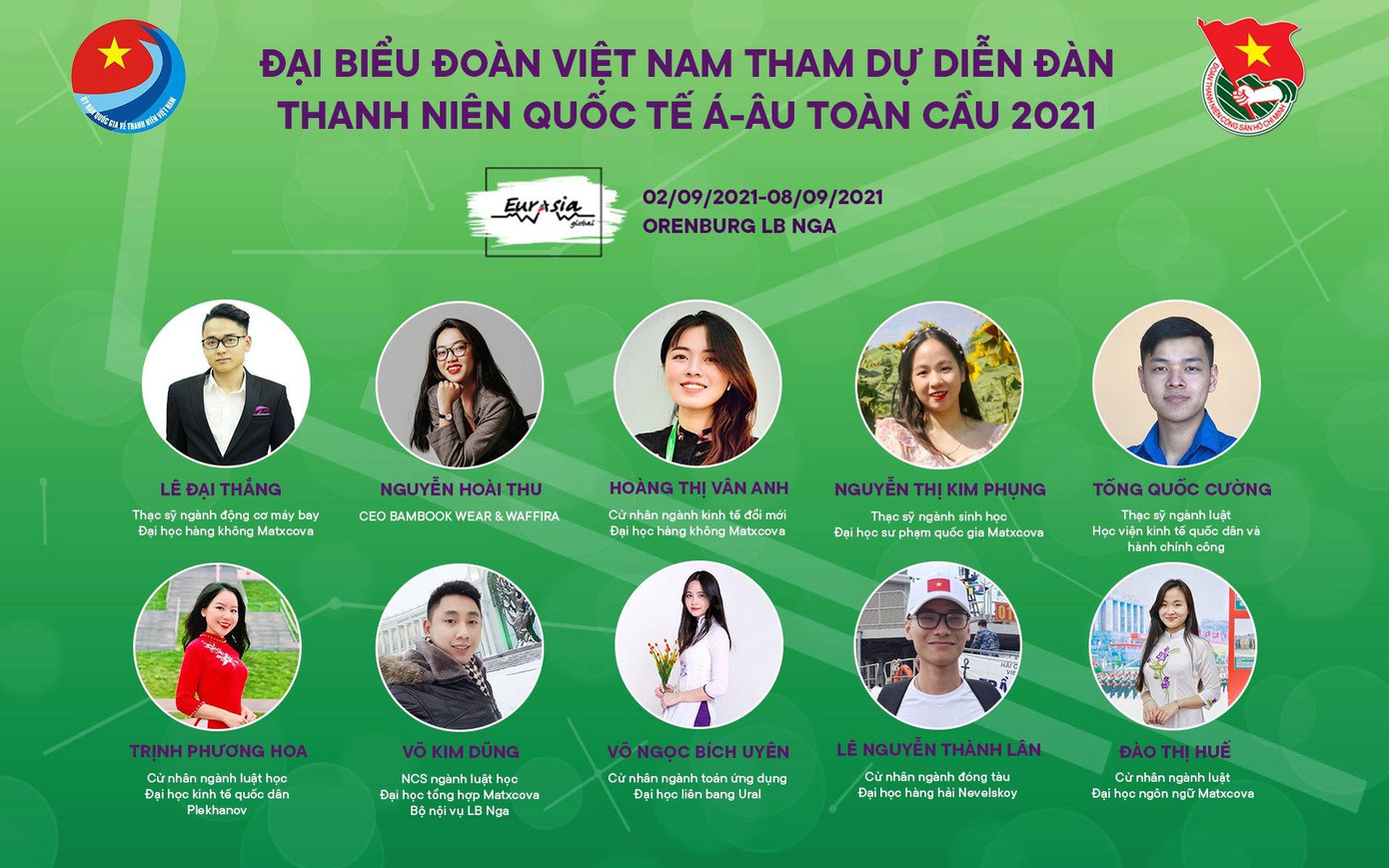 Nhận lời mời của Cơ quan Liên bang Nga về công tác thanh niên, T.Ư Đoàn cử 10 đại biểu thanh niên, sinh viên Việt Nam đang công tác, học tập, sinh sống tại Liên bang Nga tham dự Diễn đàn Quốc tế Á - Âu Global. Các đại biểu là thanh niên, sinh viên đang công tác, học tập, sinh sống tại Liên bang Nga.