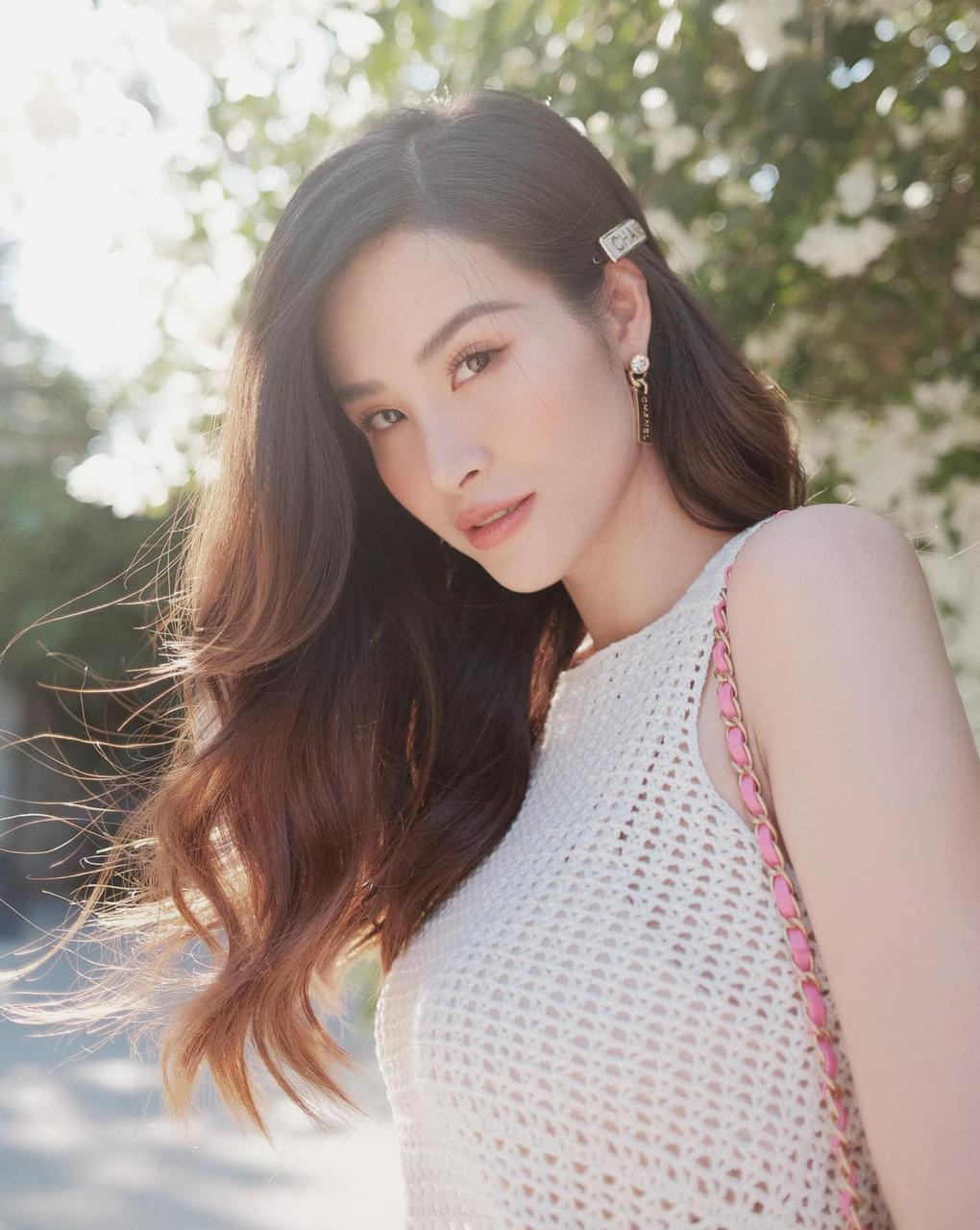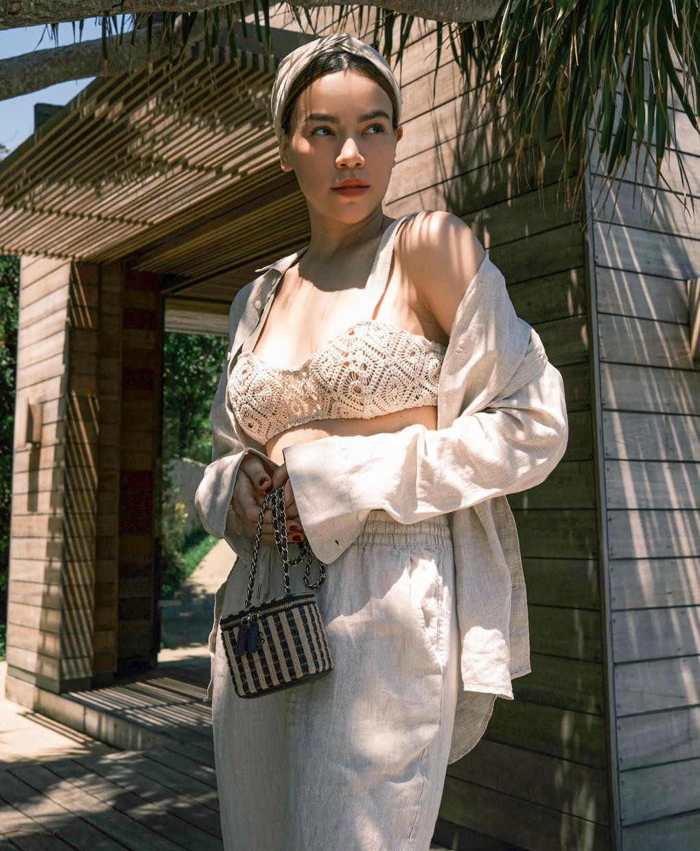 Minh Hằng cũng chọn áo hai dây len móc cho mùa Hè năm nay. Hẳn nhiều cô gái cũng thích phối đồ như Minh Hằng để có diện mạo đậm chất mùa Hè.