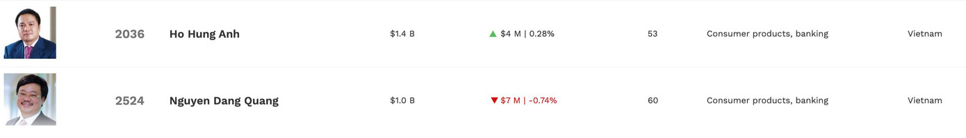 Tỷ phú Trần Bá Dương và gia đình, tỷ phú Hồ Hùng Anh cũng có khối tài sản 1,4 tỷ USD, lần lượt xếp hạng 1975 và 2036 thế giới, cũng thăng hạng so với tuần trước.