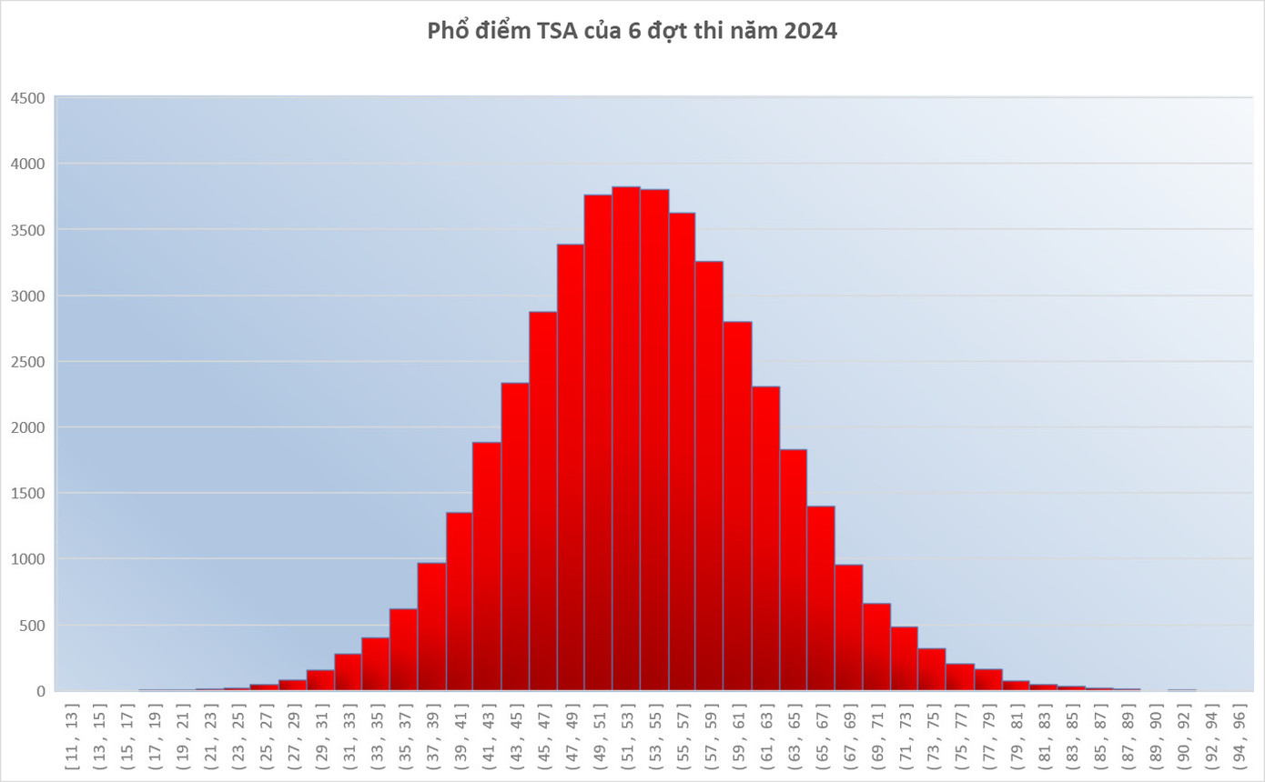 Kỳ thi TSA 2024 đã đạt được những con số rất ấn tượng với 6 đợt thi và hơn 40.000 lượt thi; số thí sinh đăng ký dự thi là hơn 20.000 thí sinh; trung bình mỗi thí sinh tham gia 2 lượt thi trong 6 đợt; trong đó có các điểm thi mới được mở rộng thêm tại Thái Bình, Hải Dương và Hà Tĩnh giúp các thí sinh dễ dàng tiếp cận kỳ thi. Điểm cao nhất của cả 6 đợt thi là 96.43 điểm; điểm trung bình của cả 6 đợt thi là 53,1. Trong đó số bài thi trên 90 điểm là 20 bài; số bài thi trên 80 điểm là 177 bài; số bài thi trên 70 điểm là 1.771.