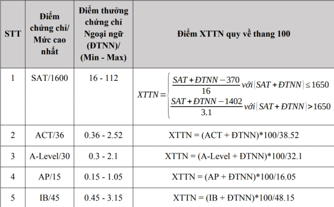 Đối với chứng chỉ A-Level và AP, chỉ xét đối với chứng chỉ có điểm thi môn Toán và 2 trong số các môn học sau: Lý/Hóa/Sinh/Tin/Khoa học/tiếng Anh.