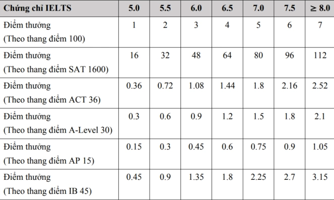 Thí sinh có chứng chỉ tiếng Anh như VSTEP, IELTS hoặc tương đương sẽ được cộng điểm thưởng vào tổng điểm chứng chỉ: