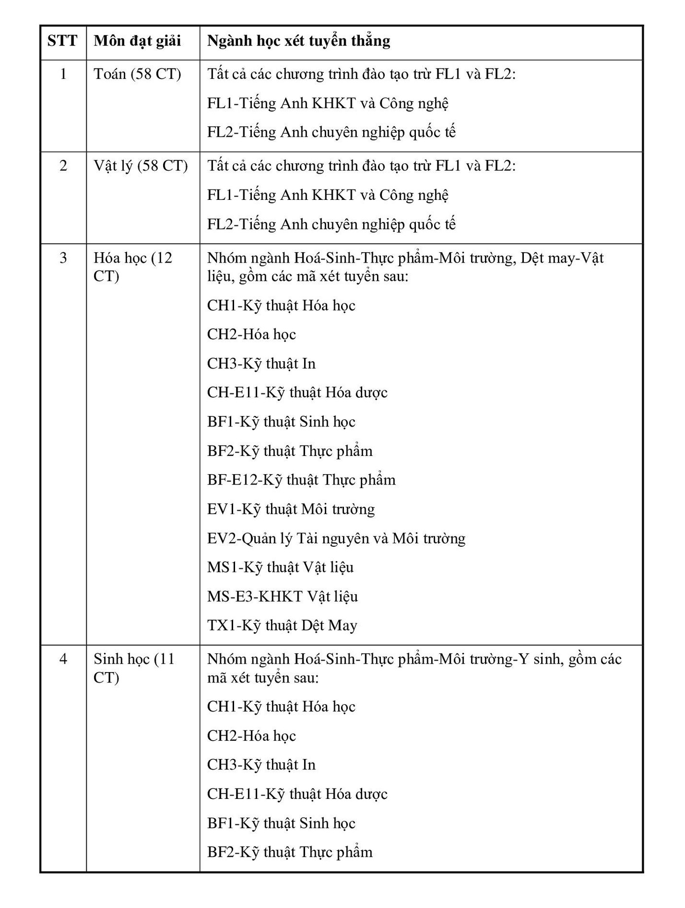 Thí sinh được triệu tập tham dự kỳ thi chọn đội tuyển quốc gia dự thi Olympic Quốc tế hoặc đoạt giải Nhất, Nhì, Ba trong kỳ thi chọn HSG Quốc gia được xét tuyển thẳng vào các ngành học phù hợp với môn đạt giải theo quy định trong bảng sau: