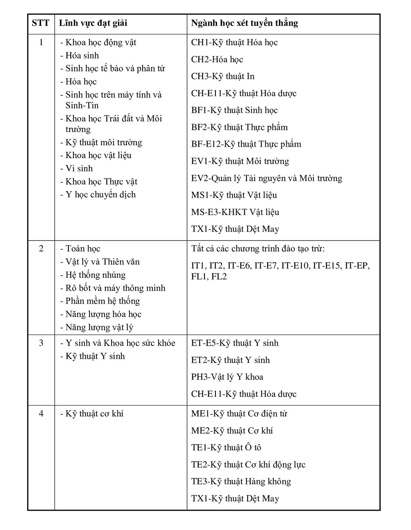 Thí sinh trong đội tuyển Quốc gia tham dự cuộc thi KHKT Quốc tế hoặc đoạt giải Nhất, Nhì, Ba trong cuộc thi KHKT cấp Quốc gia do Bộ GD&ĐT tổ chức được xét tuyển thẳng vào ngành học phù hợp với lĩnh vực đề tài dự thi theo quy định trong bảng sau:
