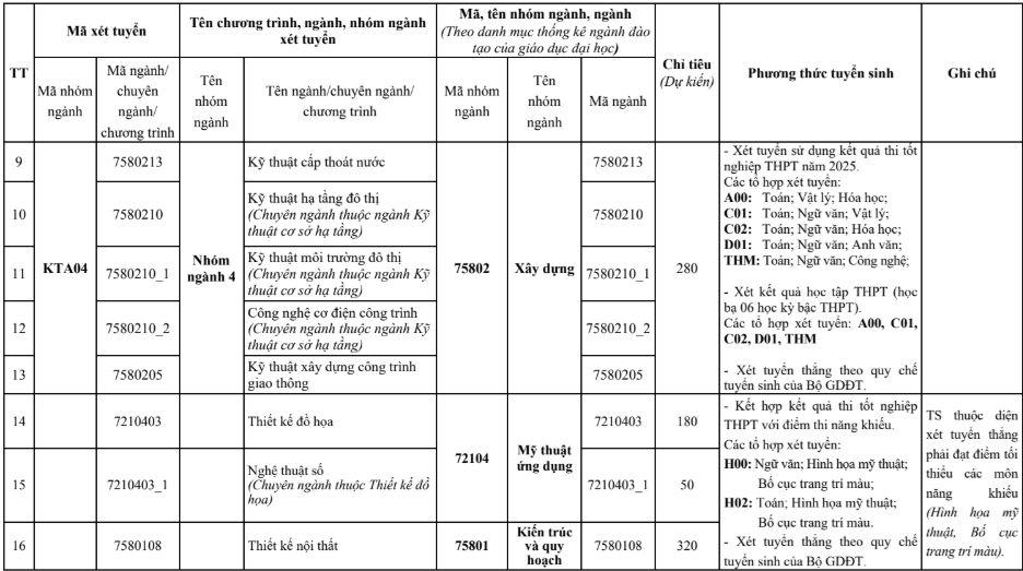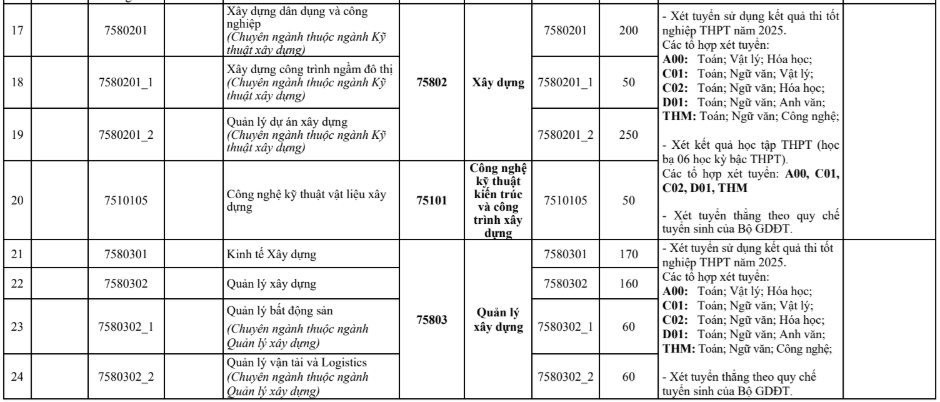 Chỉ tiêu và tổ hợp xét tuyển từng ngành năm 2025 của trường Đại học Kiến trúc Hà Nội cụ thể như sau: