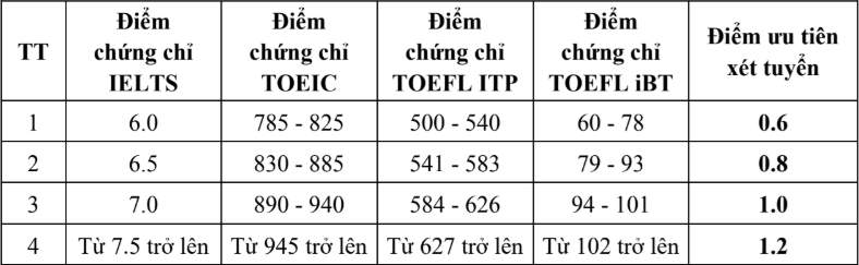 Thí sinh có chứng chỉ tiếng Anh theo quy định đạt điểm IELTS từ 6.0 và điểm các chứng chỉ tương đương trong bảng sau, đăng ký xét tuyển chương trình tiên tiến ngành Kiến trúc của Trường sẽ được xét cộng điểm ưu tiên xét tuyển vào tổ hợp môn xét tuyển, nhưng không vượt quá mức điểm tối đa của thang điểm.