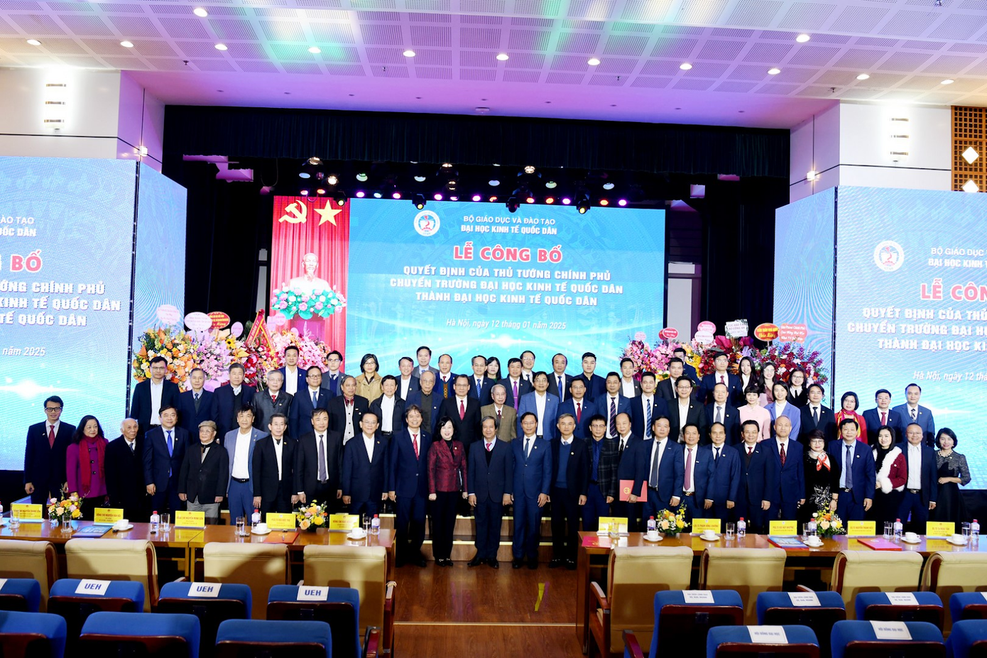 | Lãnh đạo Đại học Kinh tế Quốc dân thực hiện nghi thức chuyển giao từ Trường Đại học Kinh tế Quốc dân thành Đại học Kinh tế Quốc dân. |